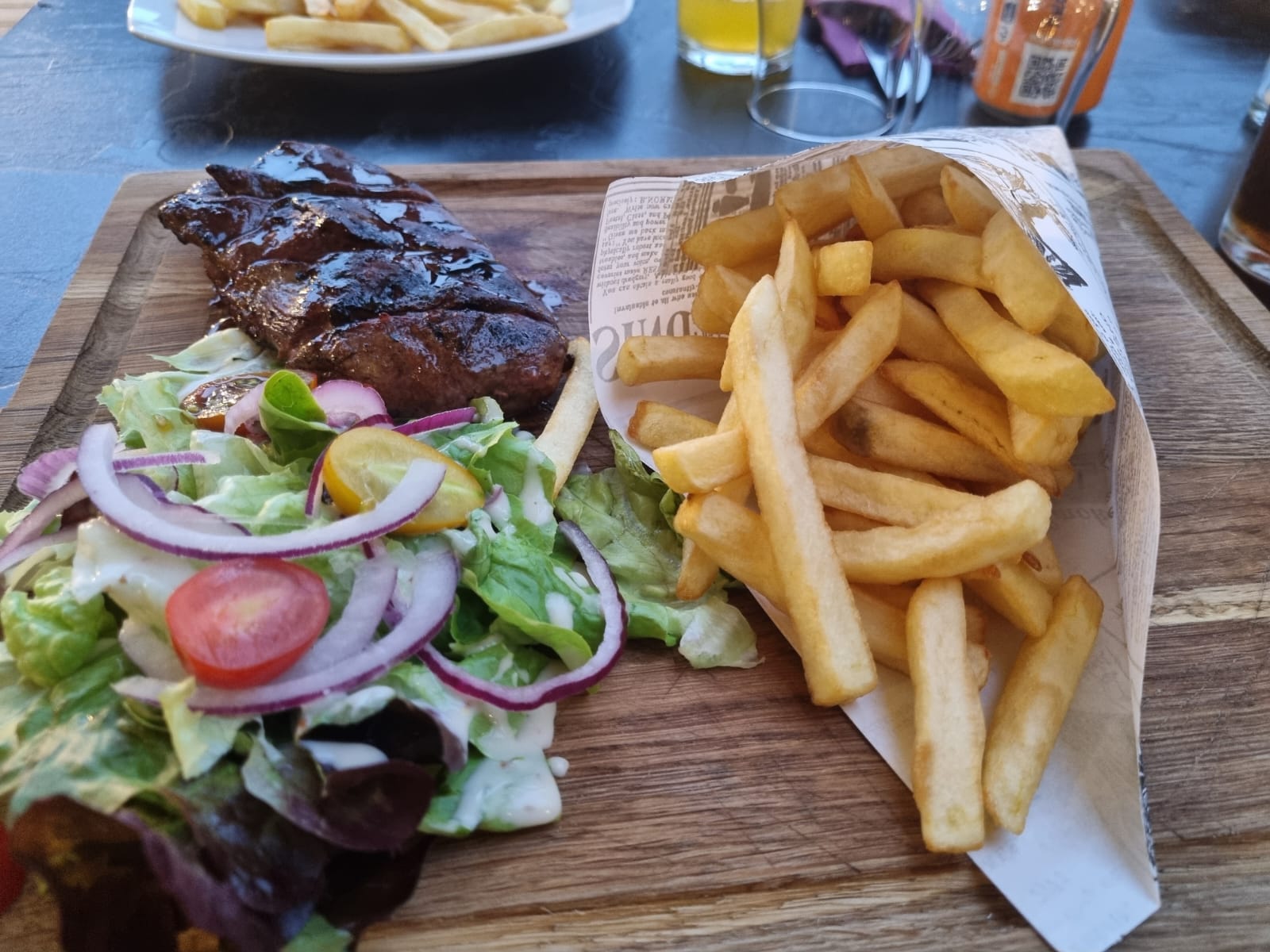 Je reste partagé sur notre expérience. Le service et l’accueil sont impeccables, il n’y a rien à redire. J’ai pris une pièce du boucher qui était moyenne, accompagnée de frites congelées et d’une salade … sans aucun doute sauce industrielle, bref je me fais pareil à la maison. L’ensemble du repas est moyen pour nous. On passera notre chemin la prochaine fois.