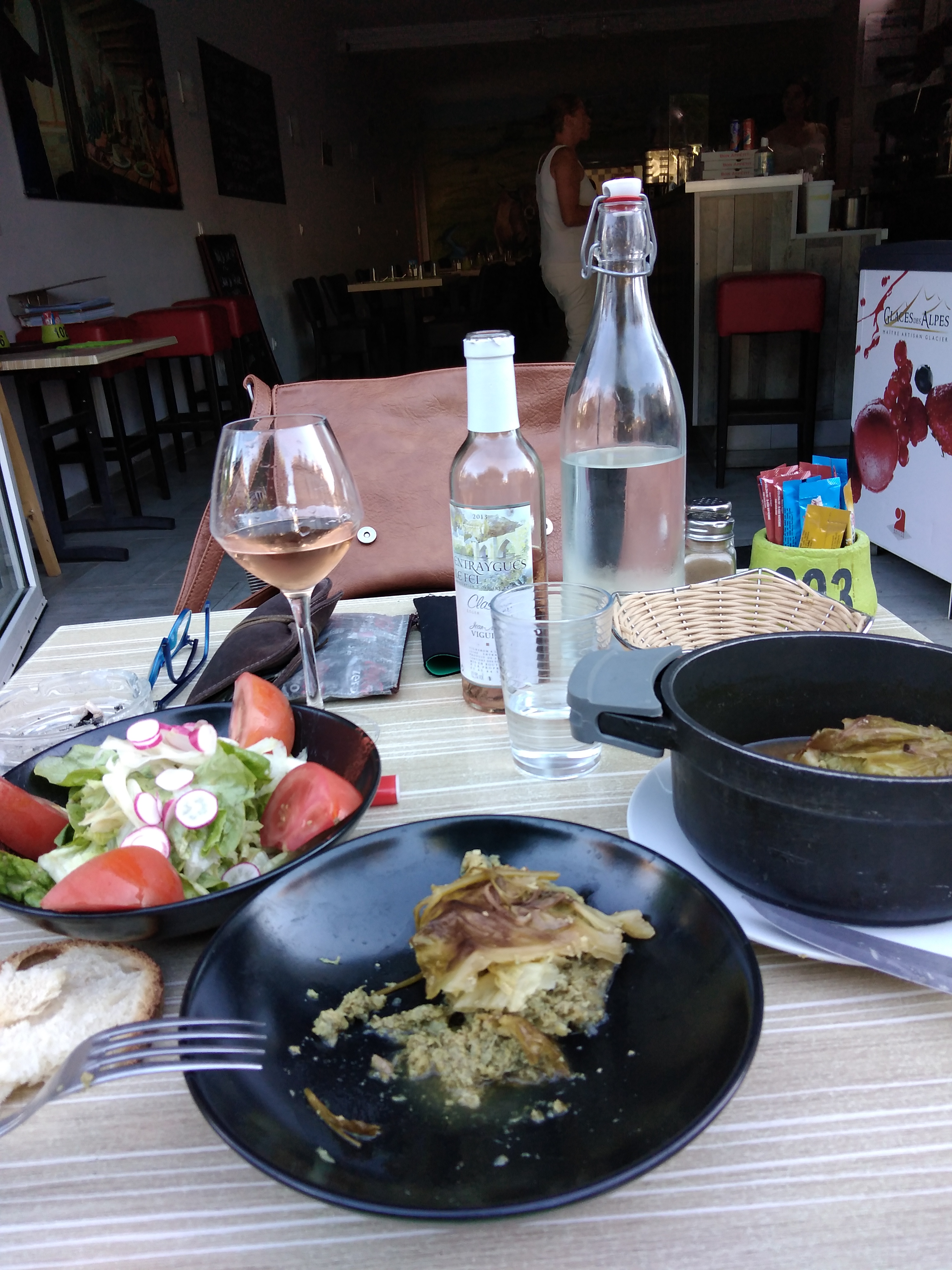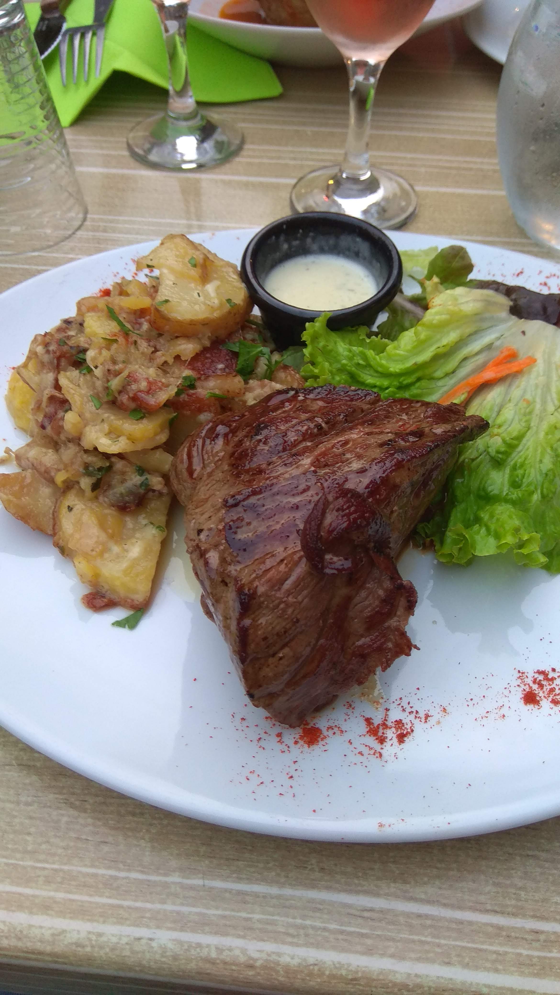 Pas de patio ombragé le midi, seulement le soir. Nous étions sur le bitume du trottoir abrité par un parasol qui gênait la circulation des petits camions. L'aligot ressemble à une purée. Il a fallu réclamer la commande du fromage qui avait été oublié... la viande bof.