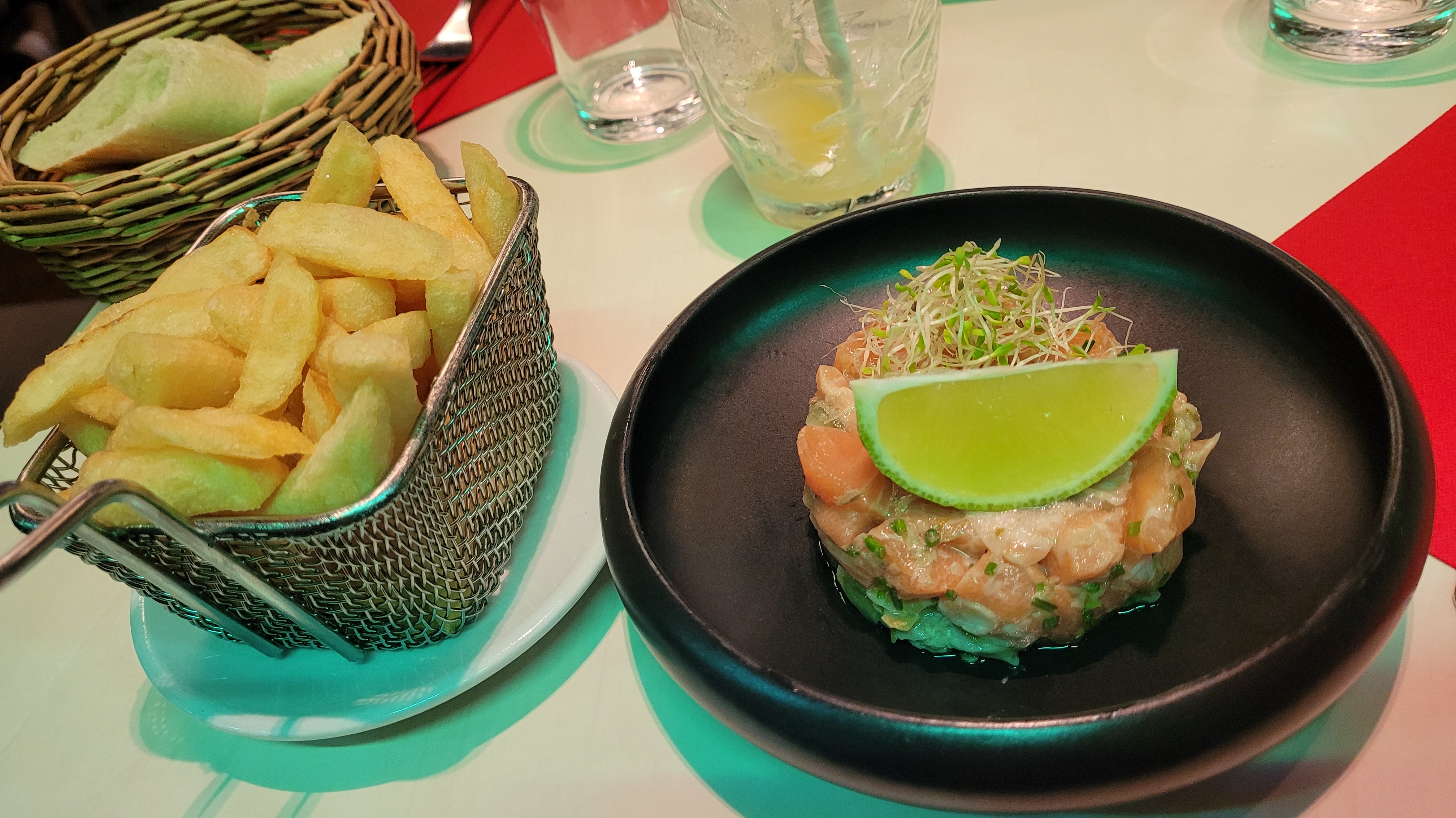 L’estrade au fond du restaurant est inconfortable, on a les jambes à angle droit ou étirées toute la soirée. Je ne comprends pas l’installation. Pour le tartare de saumon, même en rajoutant du sel et du citron, c’était fade. Pour le cheesecake de saumon, il n’y en a que sur le dessus. Surprise à la table d’à côté, on change les couverts alors que j’ai du couper ma viande avec le couteau de l’entrée. Beaucoup d’imperfections, je pense qu’il ne manquerait pas grand chose pour améliorer les plats.