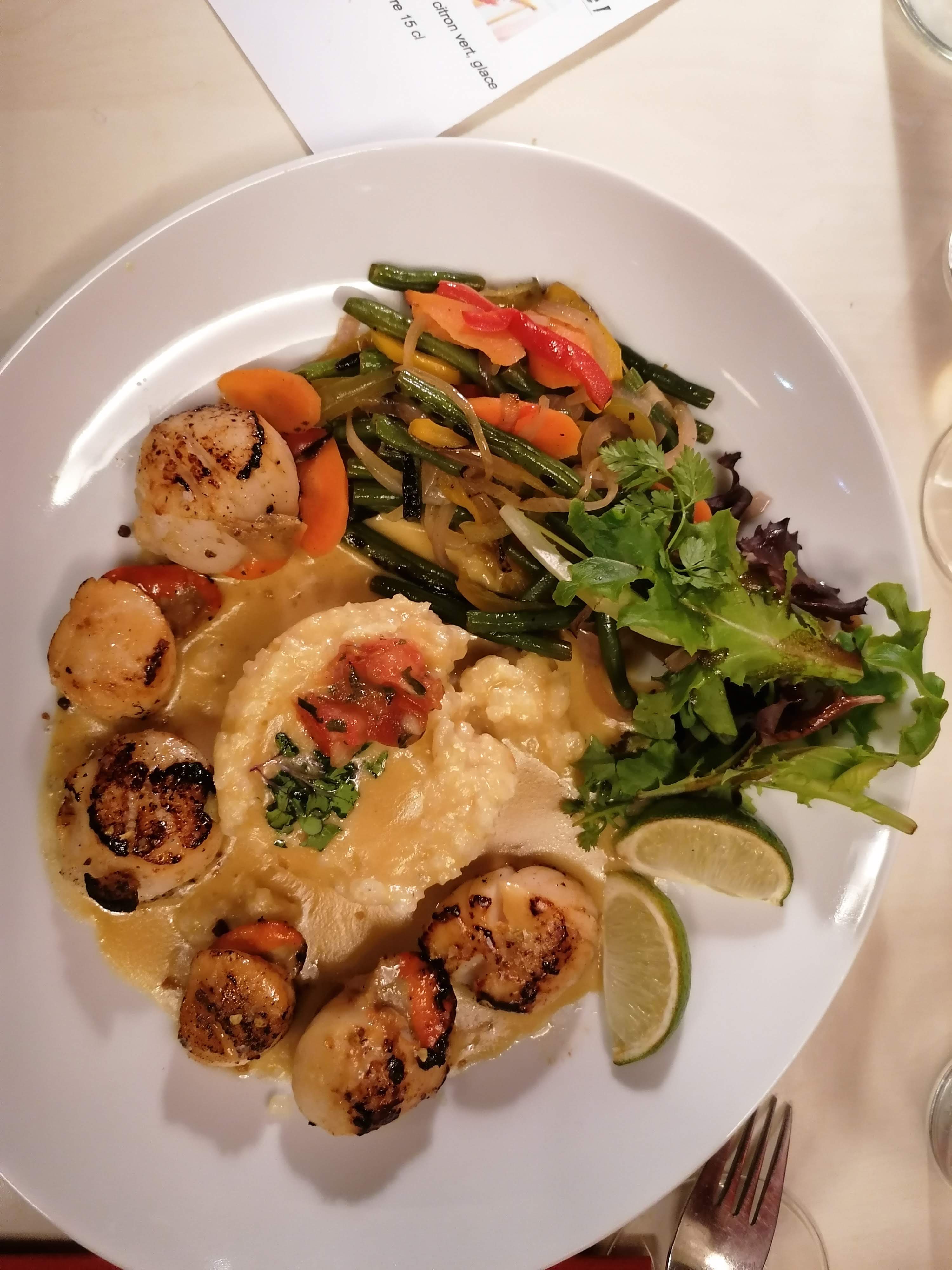 Très bonne assiette de poisson à la plancha.Très bon crumble de courgettes et petite sauce parfumée à tomber.belle présentation. Personnel très agréable . Ambiance détendue malgré l'affluence
