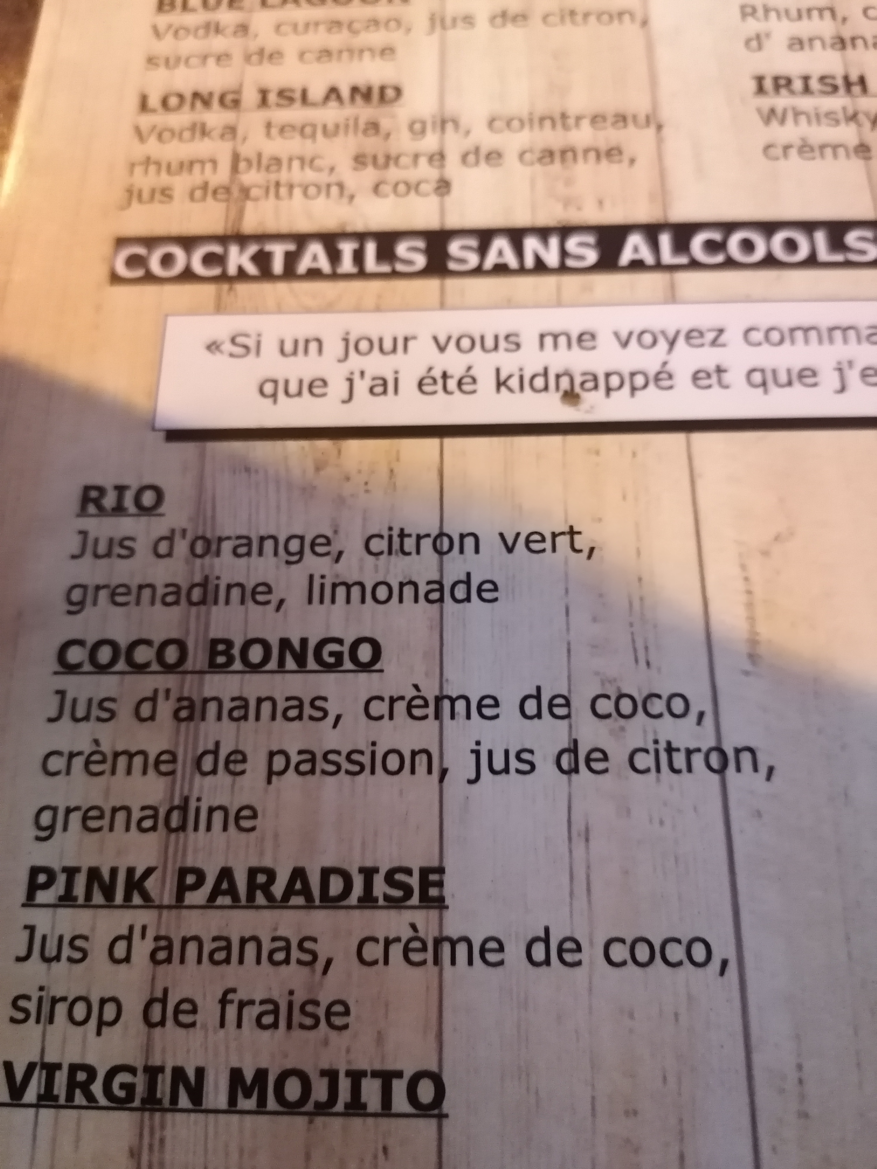 Grosse anarque pour un virjin mojito sans alcool.... Trois quart du verre avec des glaçons, feuilles de menthe, un morceau de citron et 1 quart de limonade. Le prix 06 euros. À fuire. Attrape touristes. Je réponds quand même : même s'il n'y a pas de limonade ça fait cher le glaçon. A bon entendeur.