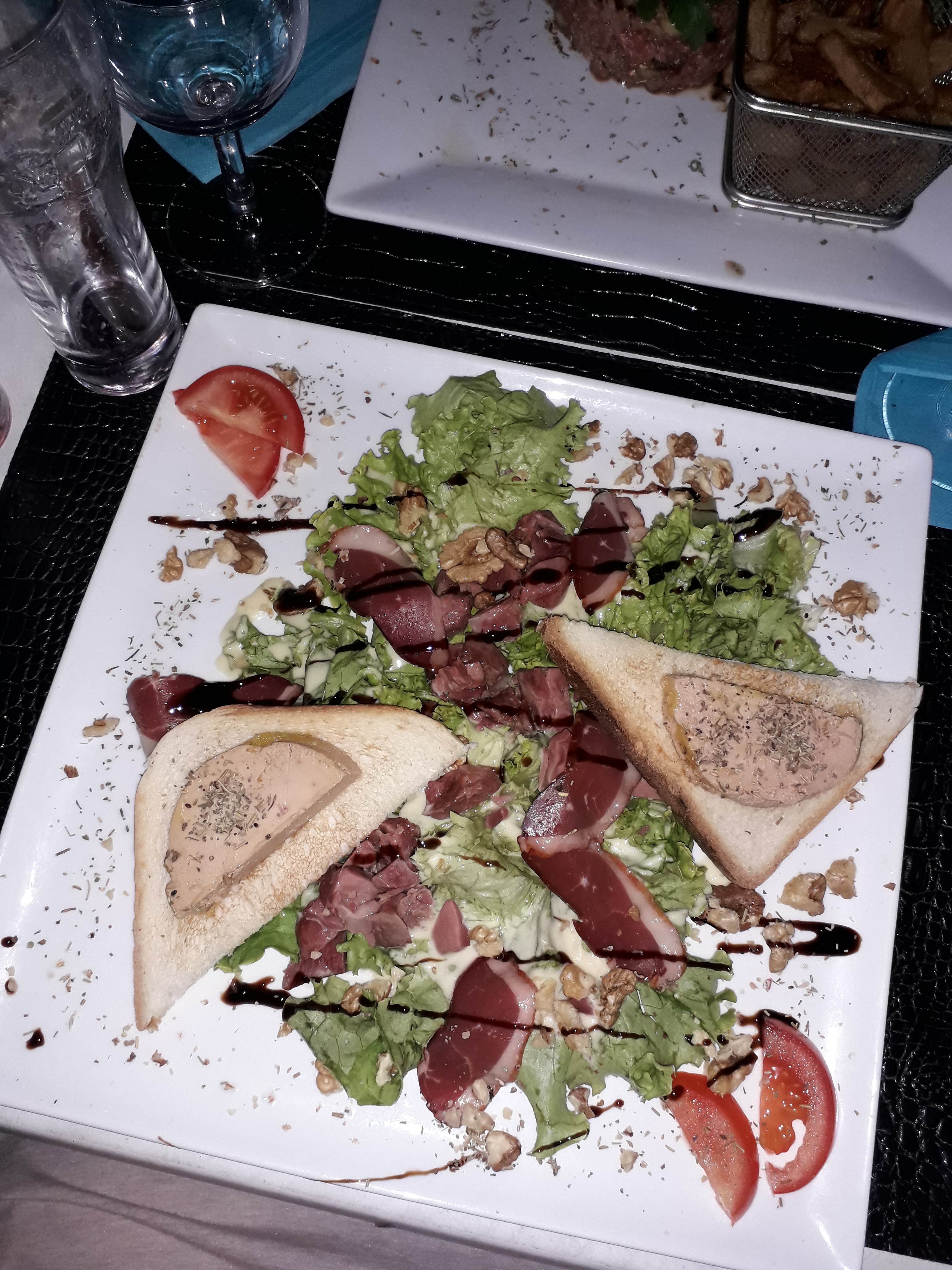 Trop bon, j'ai pris des tagliatelles aux saumon et une glace chantilly. Mon mari une entrée chèvre chaude, une forestière, trop bon. En plus mes petits enfants ont joués avec les jet d'eau, vraiment un plaisir. Une petite ville a venir visiter, et ne pas rater les dinosaures gratuit.