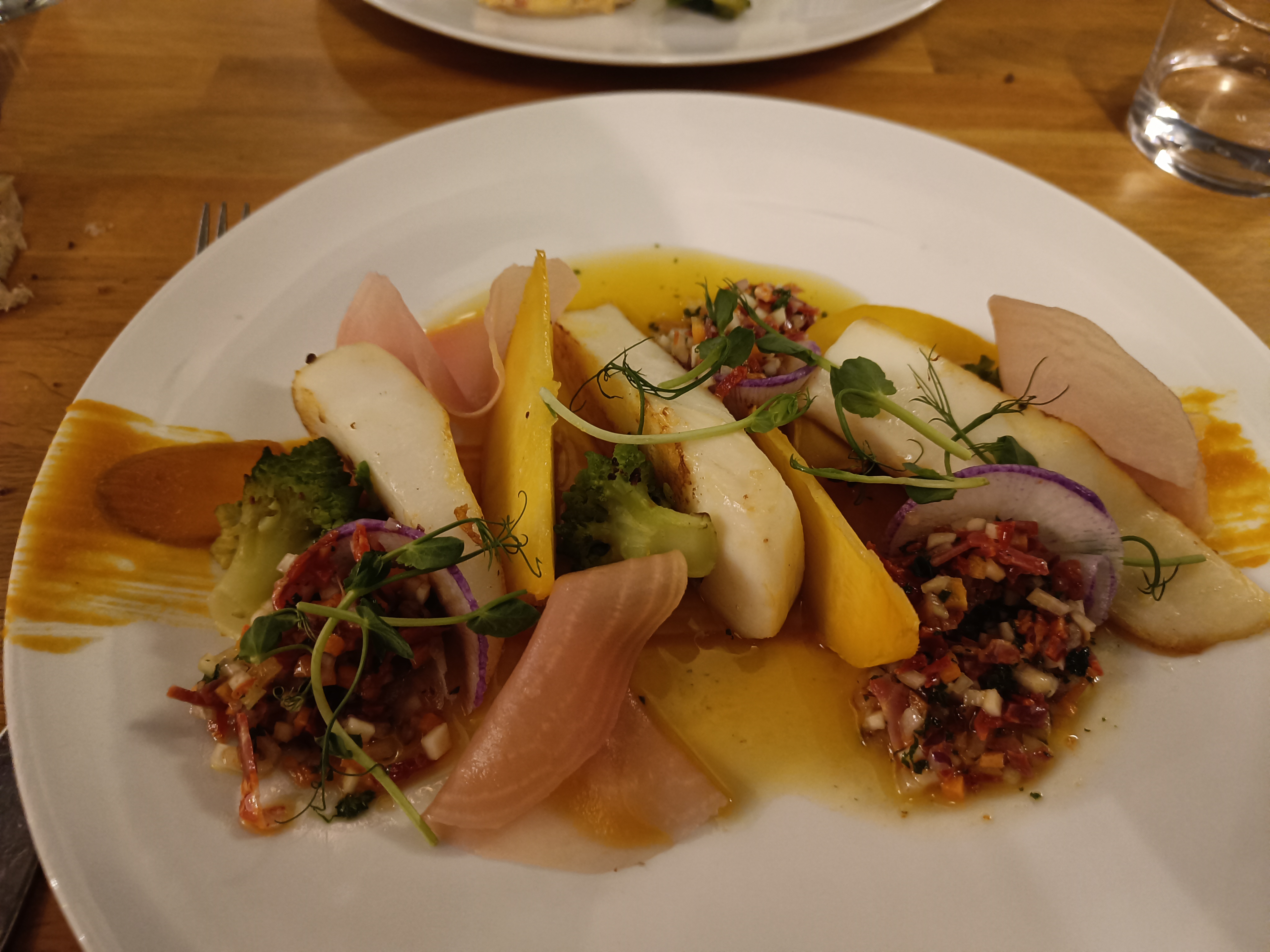 L'entrée était très bonne, le tataki de thon était trop cuit à mon goût en plus il était servi froid, je n'ai pas apprécié le thon. En revanche les légumes étaient très bons. Dommage que nous ayons attendu plus de 30 minutes nos desserts.