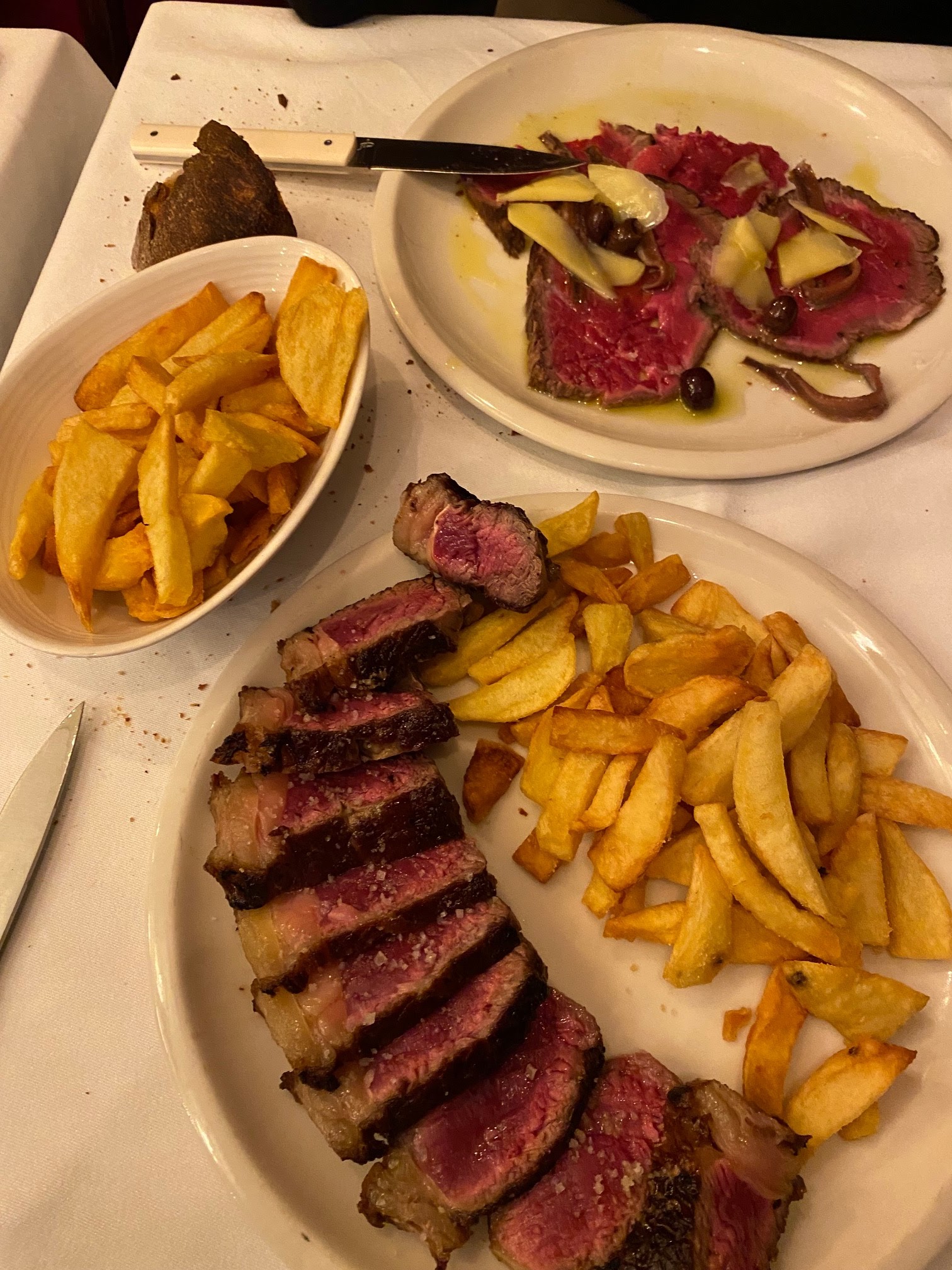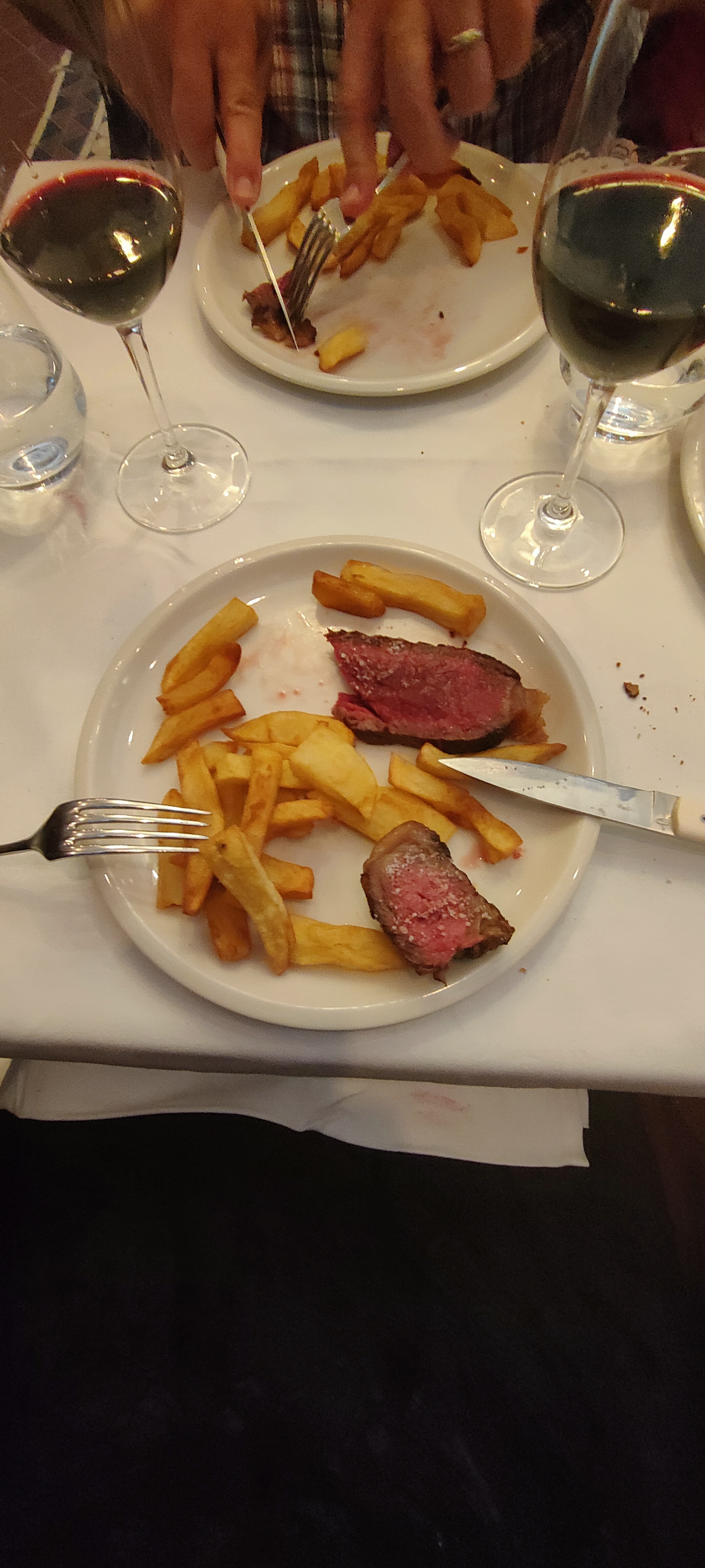 C'est une belle viande. Le prix d'un steak pour 2 ou 3 personnes est passé à 180 euros. La portion est parfaite pour 4 personnes à partager. Il est accompagné de délicieuses frites, il est donc préférable de commander un ou deux plats en entrée. Même si la carte des vins n'a pas été actualisée, les classiques sont nombreux.