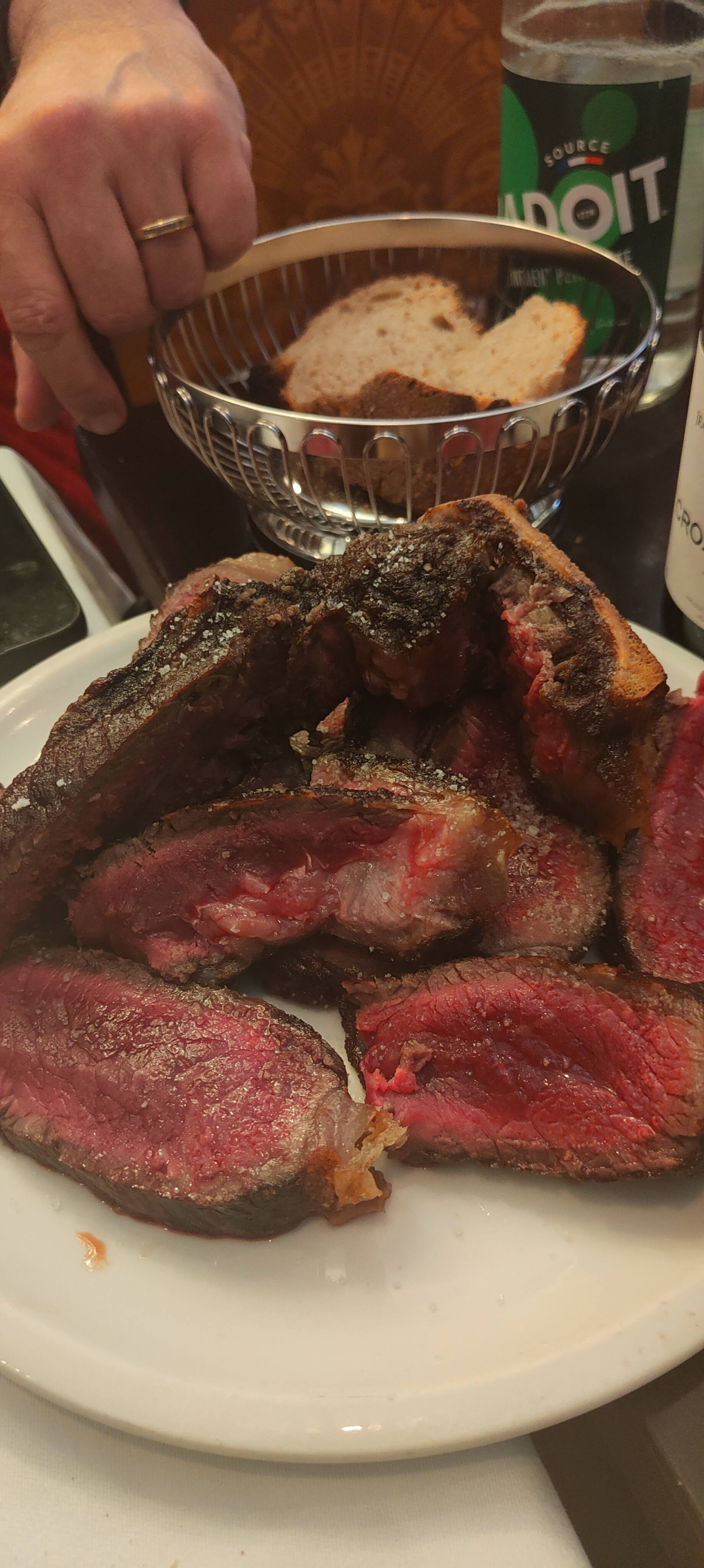 Bien que de nous quatre, je sois le moins amateur de steak du groupe, Le Severo a conquis mon cœur. Les faux filets vieillis sont incroyables, et ce sont peut-être les meilleures frites de tout Paris. Nous faisons des réservations car l'endroit est minuscule - et avons été accueillis avec chaleur et humour par les deux hommes qui s'occupent de la devanture de la maison. Nous leur demandons toujours quel vin commander - et le Gevret Chambertin de Tonite était incroyable. - cher, mais raisonnable pour le millésime. Oui, nous essayons de parler autant français que possible - et ils corrigent gentiment nos erreurs !