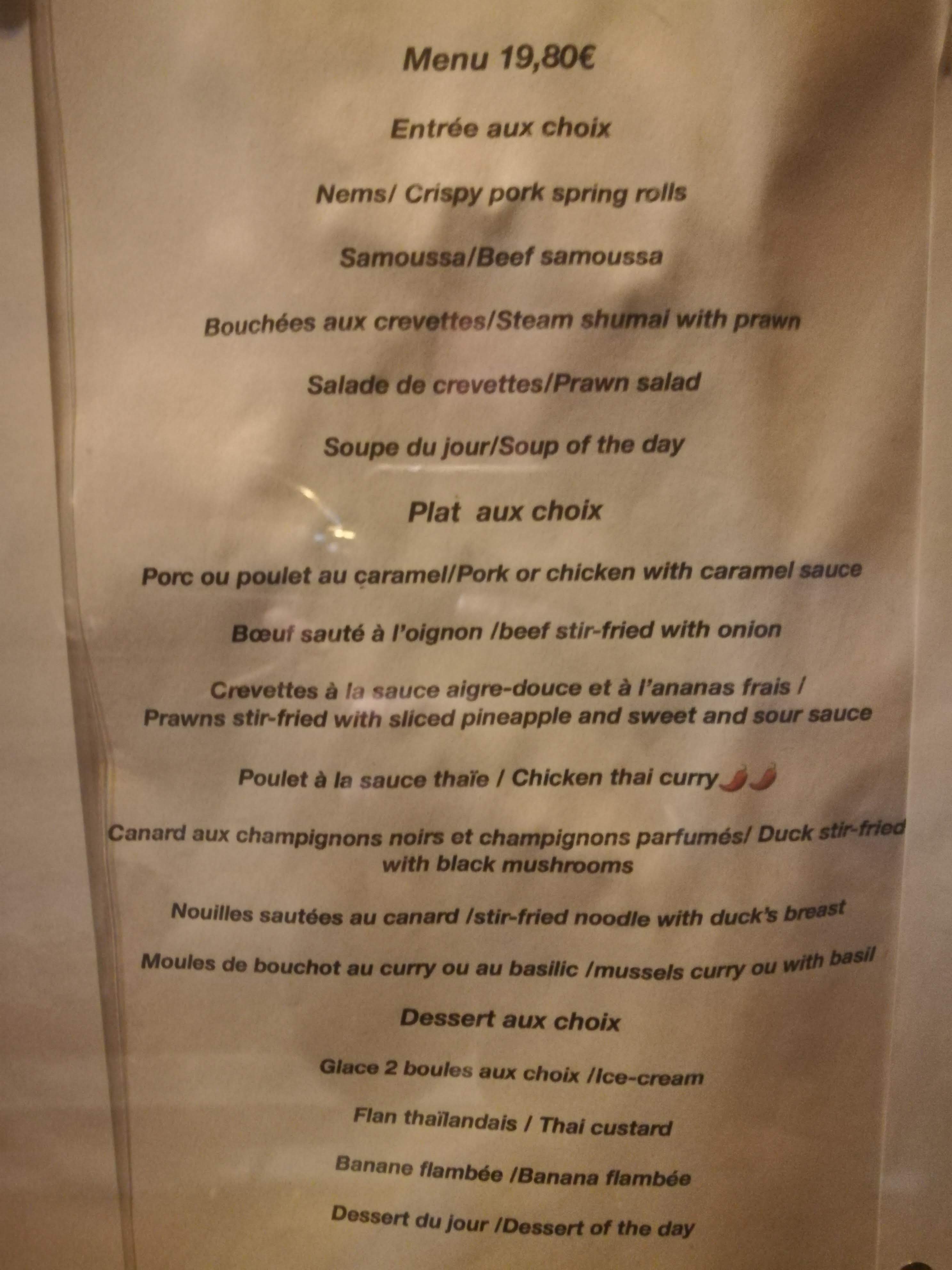 Rapport qualité-prix exceptionnel Service rapide, agréable Menus du jour pour 2 : rien à redire, les quantités sont là et surtout la qualité au rendez-vous pour 14.50 entrée plat dessert : Bouchées de porc riche en goût, rouleaux de printemps très frais Boeuf au curry surprenant par sa viande très tendre, légume frais et la sauce parfaitement équilibrée ; porc à l'ananas d'un autre côté tout aussi efficace, saveurs agréablement audacieuses Les desserts maison qui cassent le cliché des desserts asiatiques : pas riche en goût, très frais que ce soit le tiramisu ou le tapioca au lait de coco ! Bref foncez-y !!