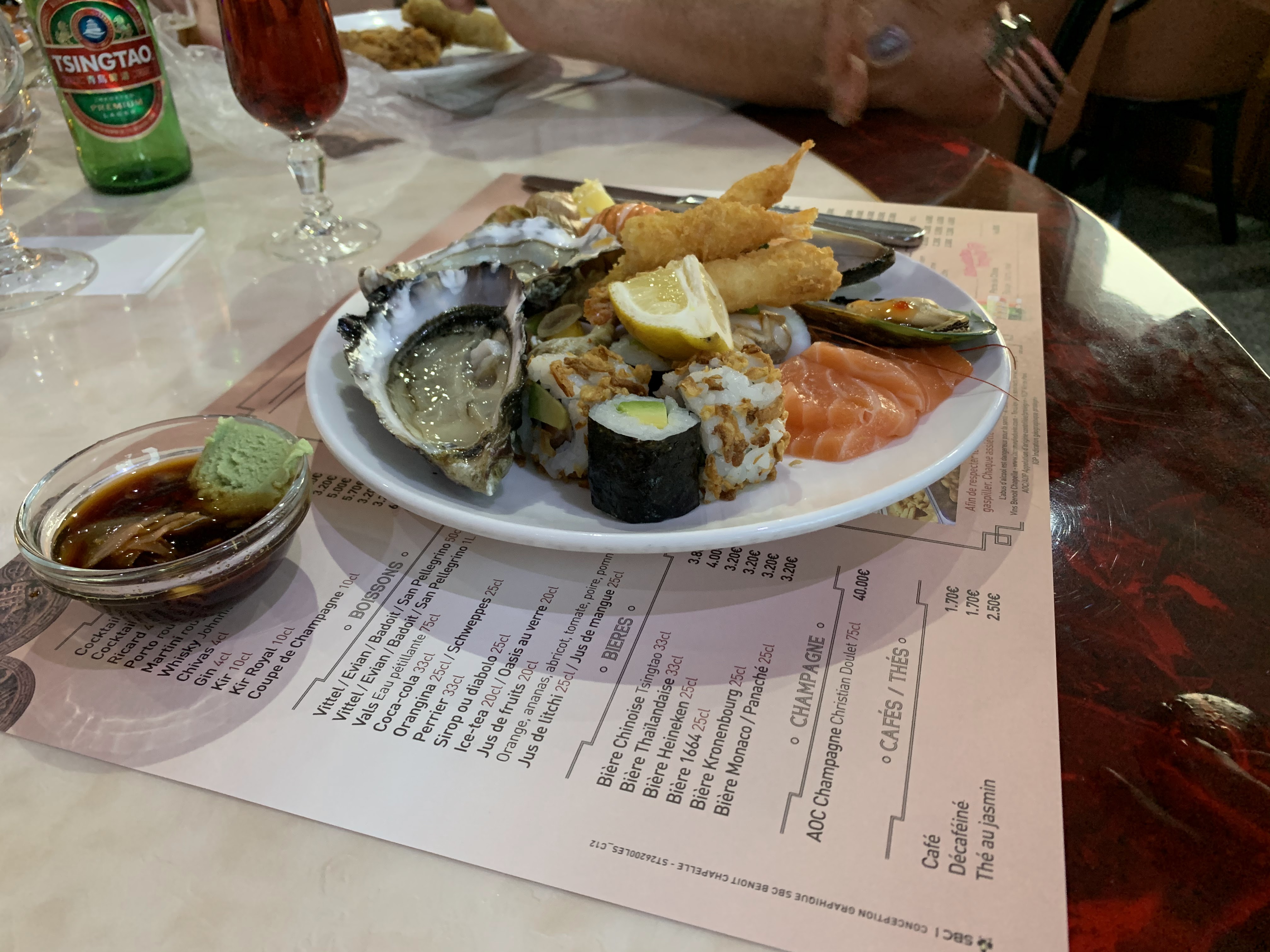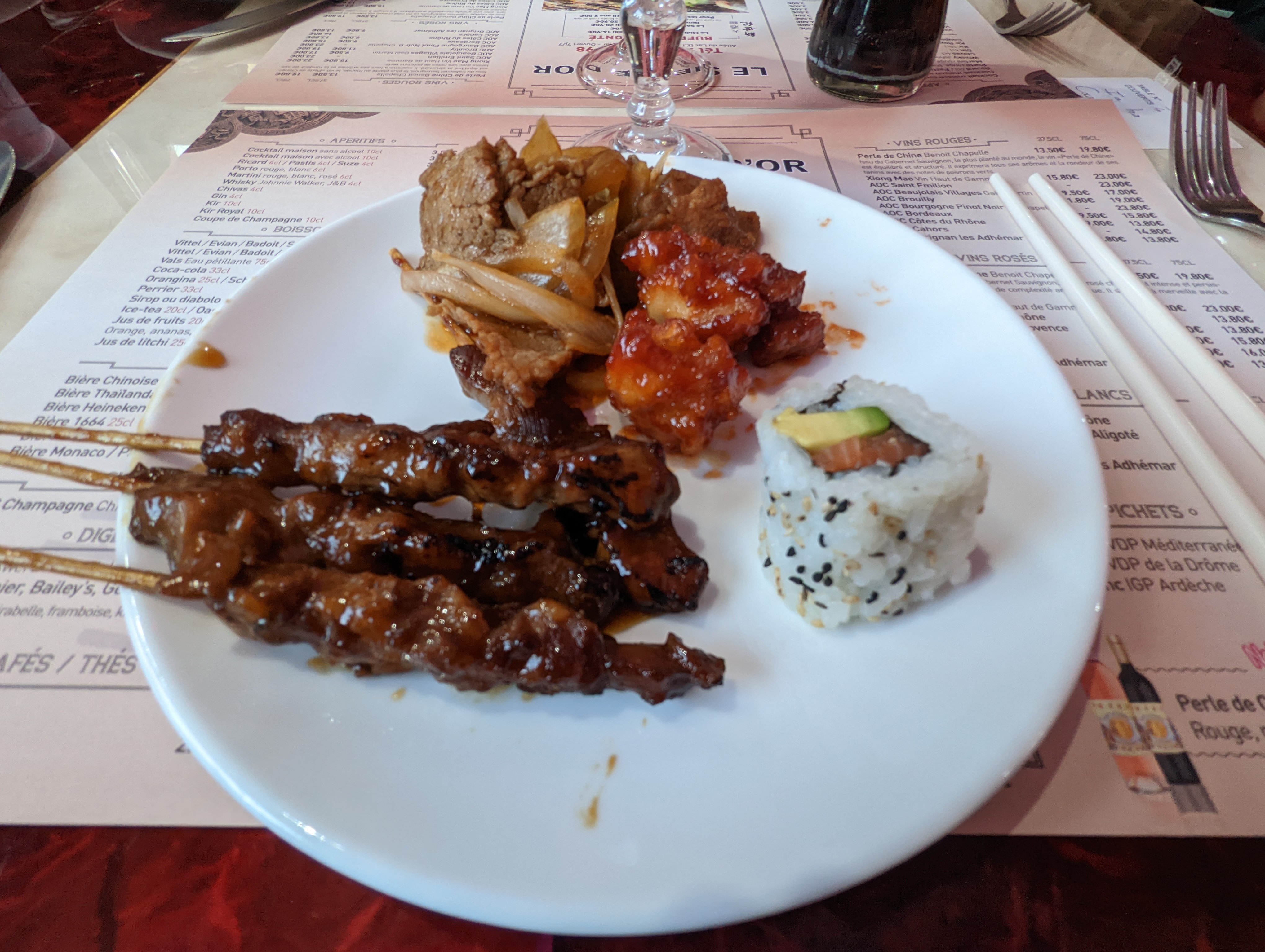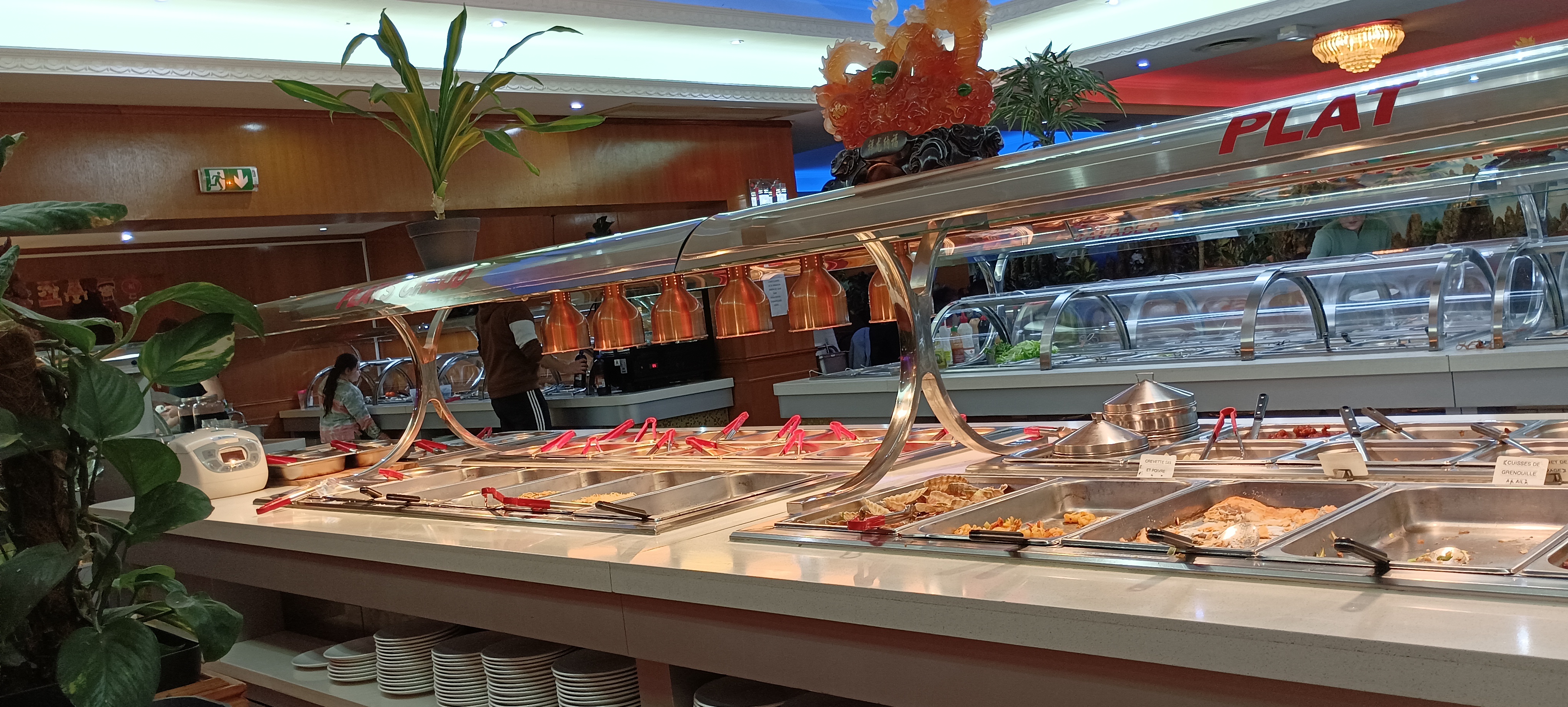 Restaurant en libre service. Fruits de mer, poissons, viandes cuites et crues (à faire cuire par le cuistot), beignets divers, nems et rouleaux de printemps, canard laqué, fromages, gâteaux, glaces. Beaucoup de choix pour un prix unique, variable entre le midi et le soir, semaine et week-end. bière et vins en sus. Il faut se limiter pour ne pas être malade. Attention, on paye les assiettes non consommées