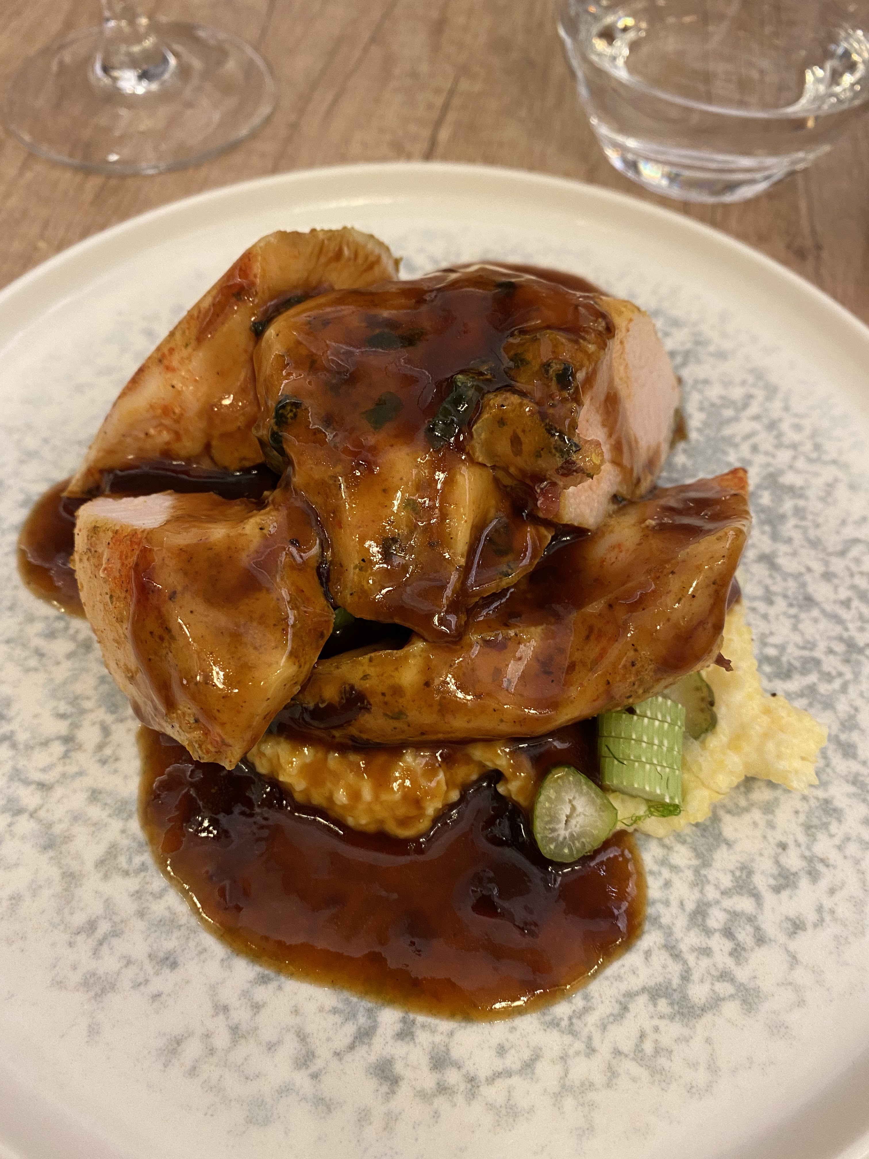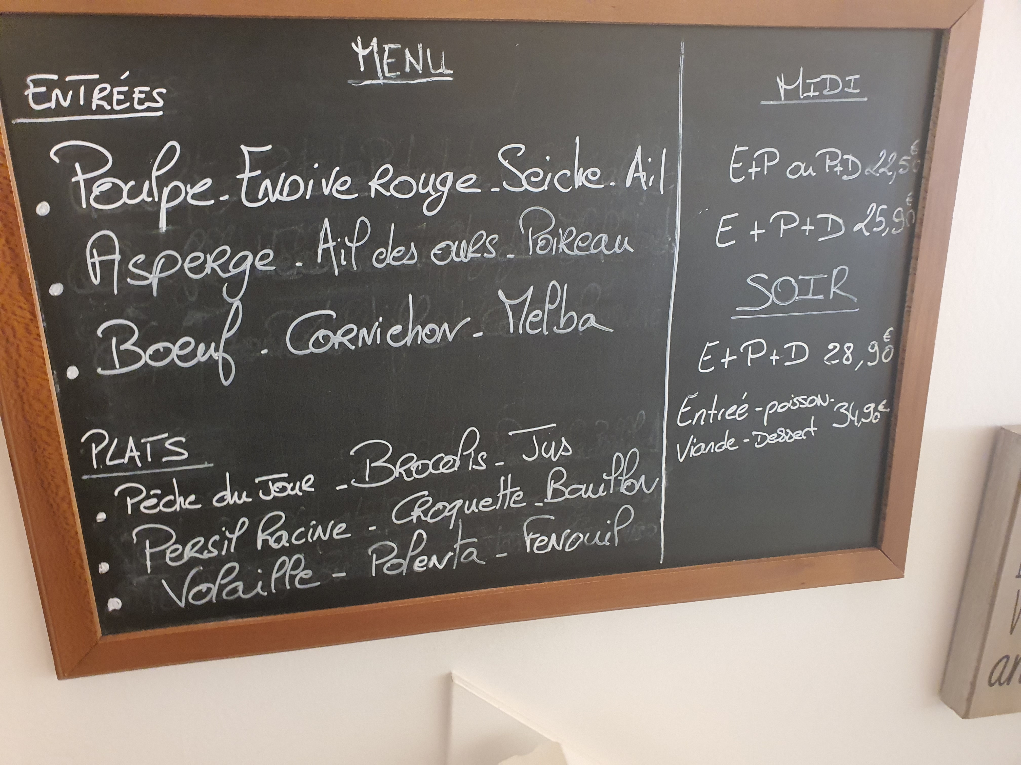 les plats sont excellents ce sont des ingrédients cuisinés simplement et sublimés par des sauces et compotées de légumes. on s est régalé. ce restaurant mérite bien son nom. attention pour les personnes à mobilité réduite il y a une marche pour accéder au restaurant et penser à demander une table en bas car il y a une salle en étage.