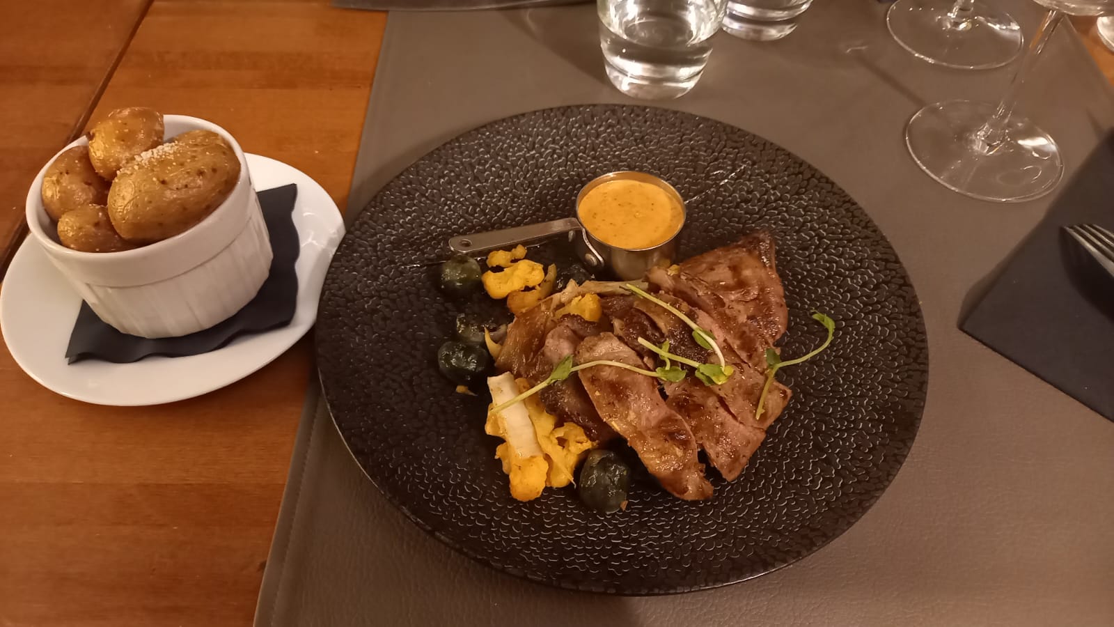 La viande est exeptionellement bonne bien cuite rien à redire . Par contre à améliorée ; J'ai pris comme accompagnement polenta un tout petit bou reçu avec Service un peut lent Boisson apero manque de fraîcheur. Au vu des tarifs pratique il faut améliorer cela ... Mais cela reste quand même une belle adresse