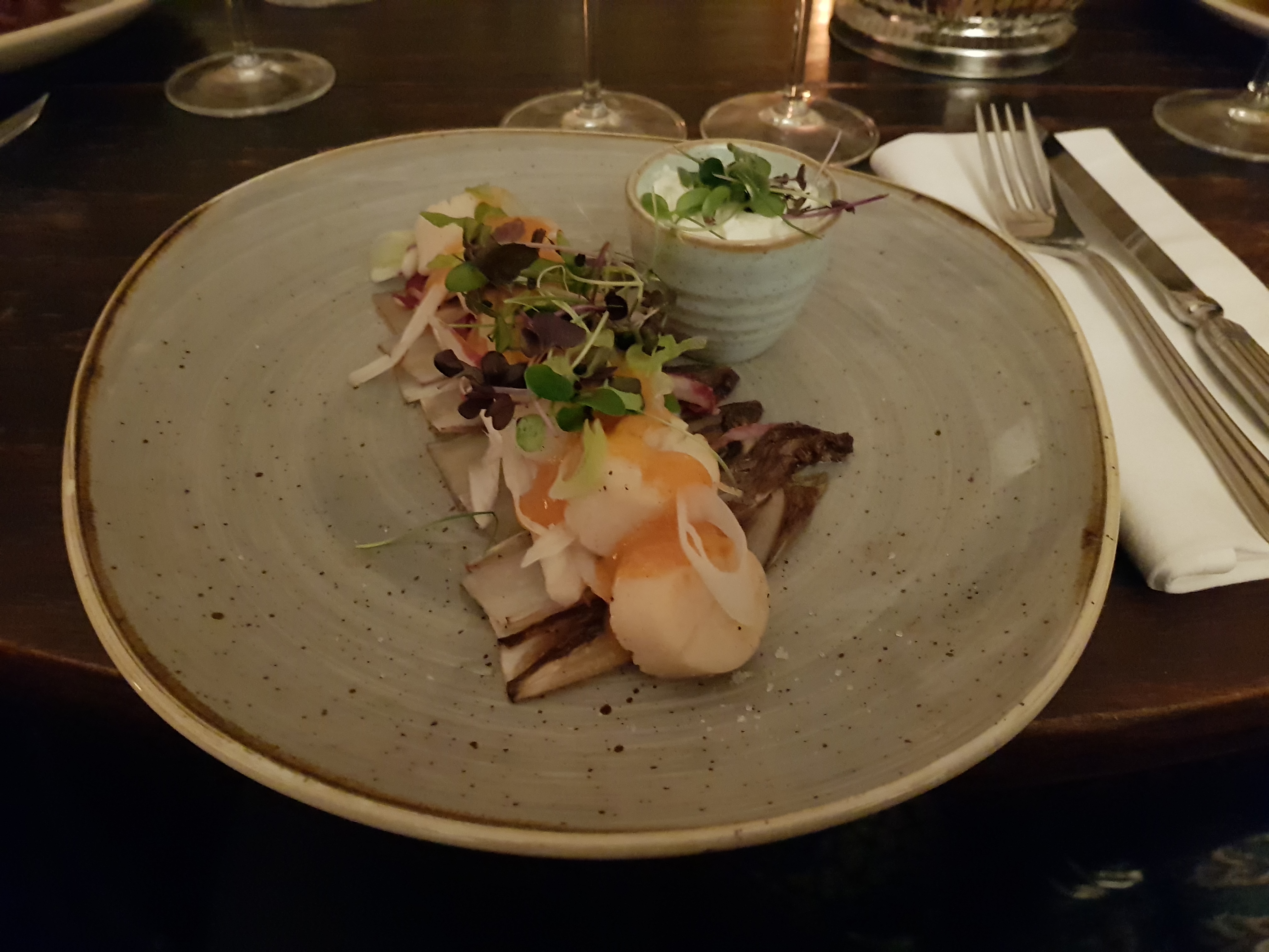 La viande sélectionnée ici est de très bonne qualité et bien cuite ! Nous avons commandé un tartare de bœuf et une salade de légumes (sans vinaigrette), nous étions un peu jaloux des tables autour de nous qui avaient commandé les options de rôti. Personnellement, j'ai l'impression que leur menu du soir était trop médiatisé et que la qualité du service n'était pas à la hauteur du prix 🤷♂️