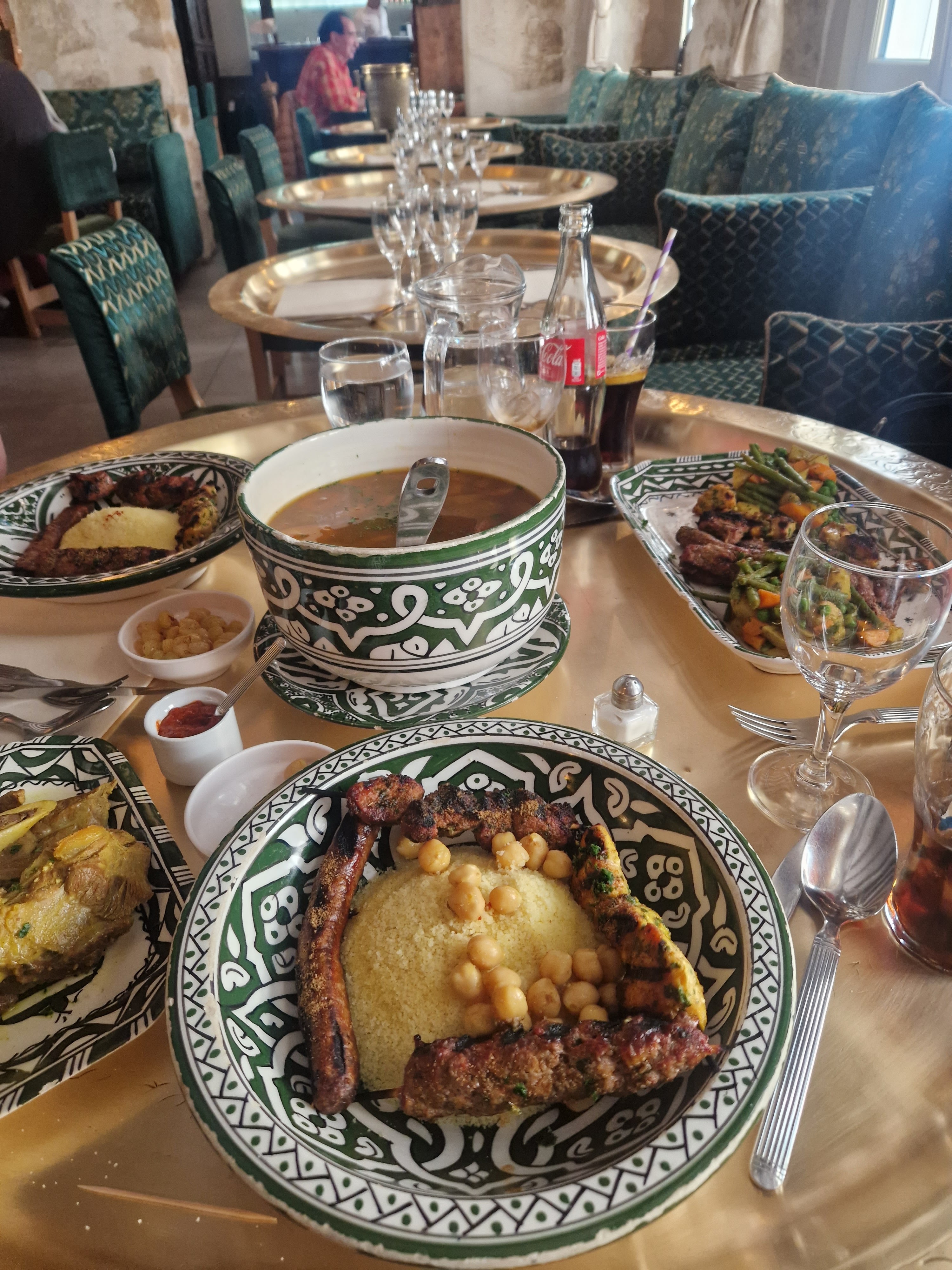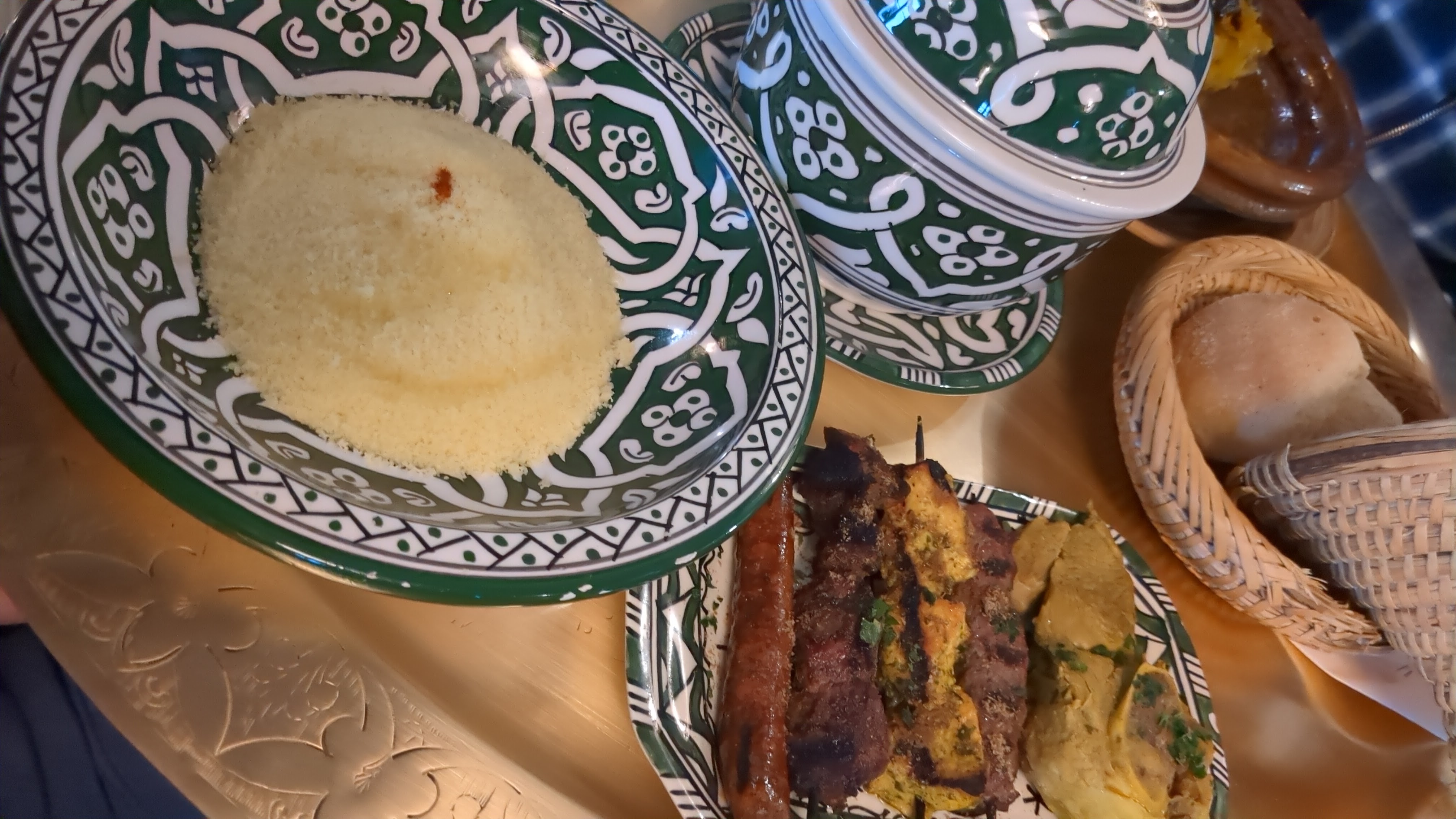 Le cadre est sympa et plutôt agréable. J'ai mangé 1 couscous et 1 tajine. Le couscous (le bouillon et ses légumes) n'avait aucun goût, donc très décevant (je ne recommande pas du coup). Le tajine était bon mais très sucré (c'est sans doute normal donc je ne juge pas le tajine). Côté semoule les portions sont très petites (où est la générosité connues d'un plat tel que le couscous ?) J'ai du redemandé 3 fois de la semoule, en plus des assiette initiales, car systématiquement une petite assiette pour 6 personnes autour de la table c'est peu. Tarifs un peu cher je trouve, dans les 20€ en moyenne le plat (disons que le cadre compense et la viande était bonne donc le tarif n'est pas non plus choquant). Petit regret personnel sur la musique (que je n'impacte sur la note) qui n'était pas, je pense, adapté (où alors je suis mal tombé ce jour là).