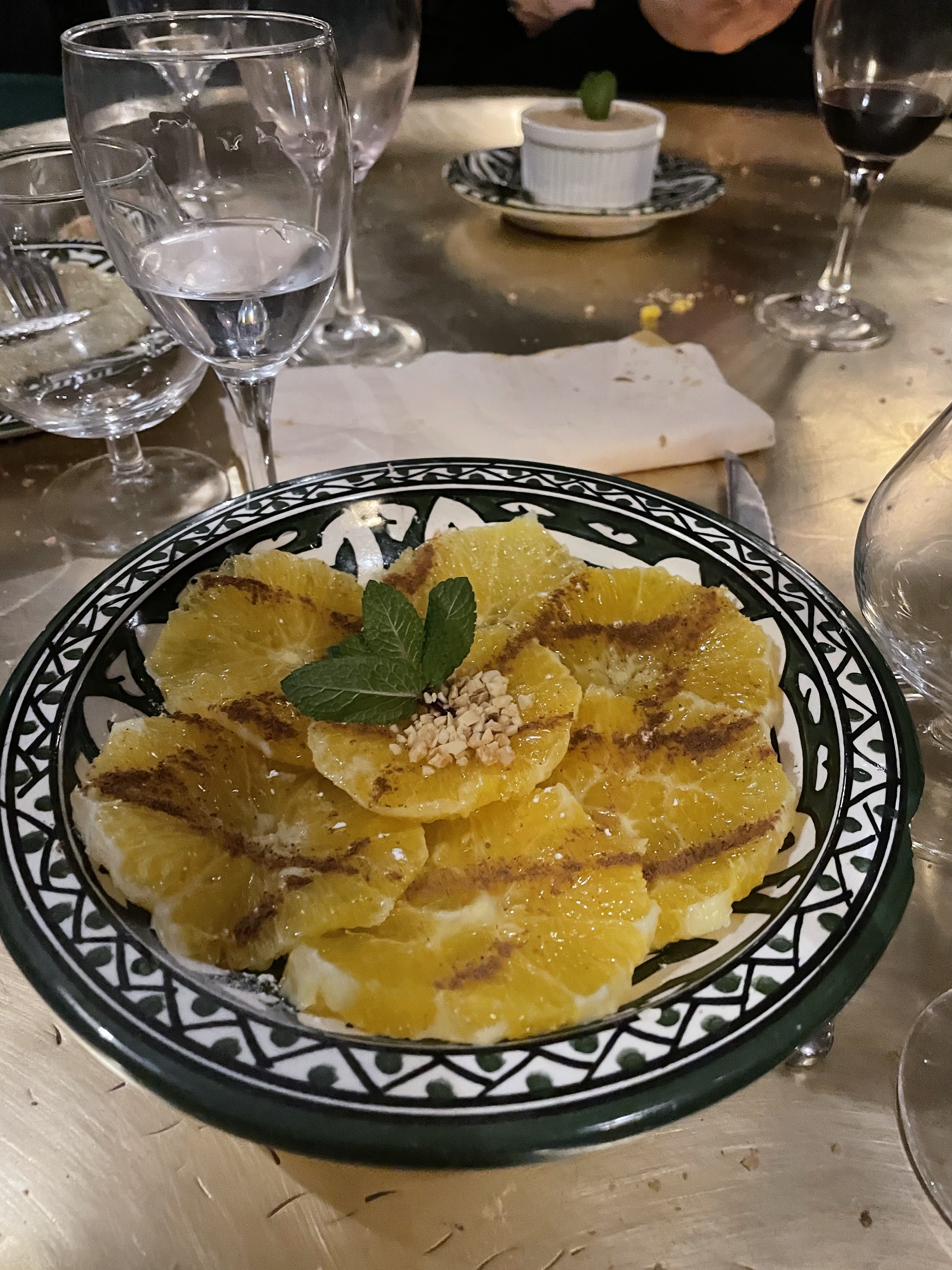 Le cadre est très pittoresque et dépaysant. Les plats sont succulents et finement épicés : nous avons ressenti toutes les saveurs distinctement. (parfums de cannelle, miel, thym, viandes,..) C'est un restaurant qui vaut véritablement le détour, d'autant plus que les personnels sont aux petits soins et débarrassent les vaisselles usagées en un temps record -ce qui, mine de rien, est très appréciable ; ils sont force de proposition en terme d'accompagnements ad-hoc selon le plat choisi et le champagne et les vins marocains sont très bons ! Quant à la pratique du service du thé à la menthe, nous n'avions jamais vu un filet si long entre la théière et la tasse 👌🏽👏🏼 Je vous recommande d'aller y déjeuner ou dîner. (En réservant c'est mieux) 😉