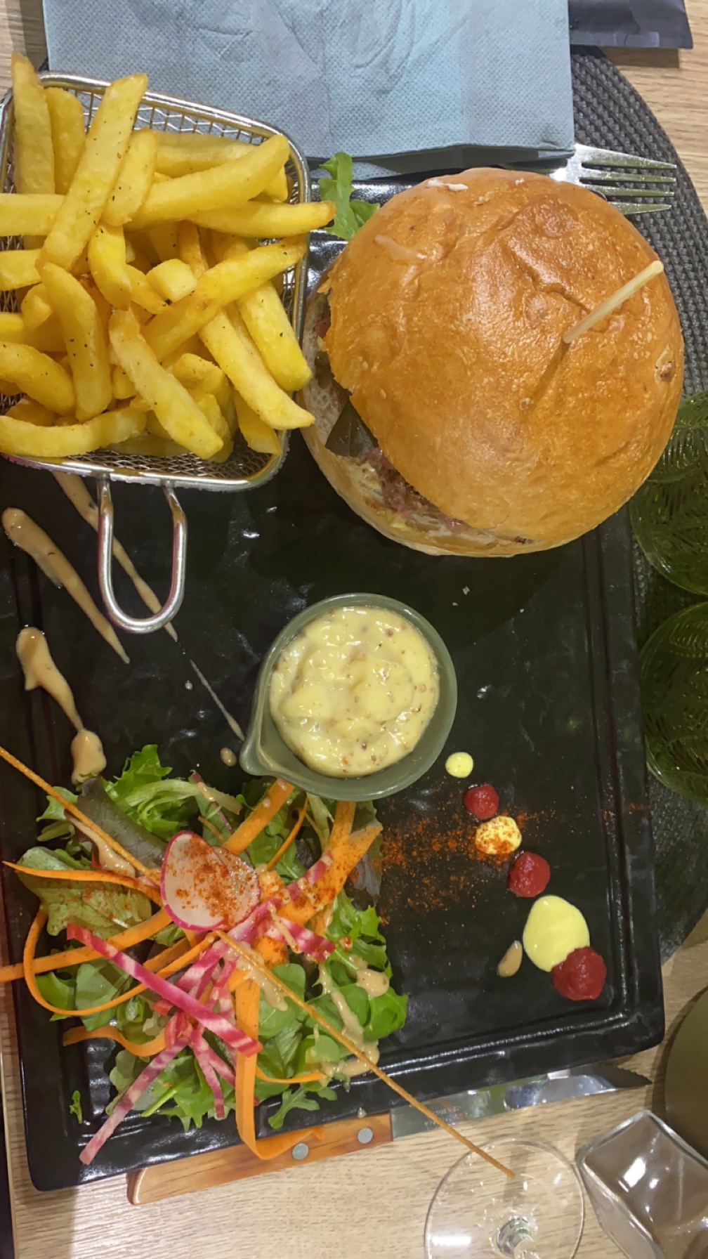 Personnel accueillant et aimable. Qualité des produits proposés et commandés: Burger à éviter. Pain surgelé recuit. Salade d’accompagnement non assaisonnée. Portion de frites en accompagnement insuffisante pour des burgers entre 14,90€ et 19,90€. Supplément de frites pour 4€ supplémentaires. Enfin pour le dessert la crème brûlée n’avait pas de goût et le chocolat liégeois passable.