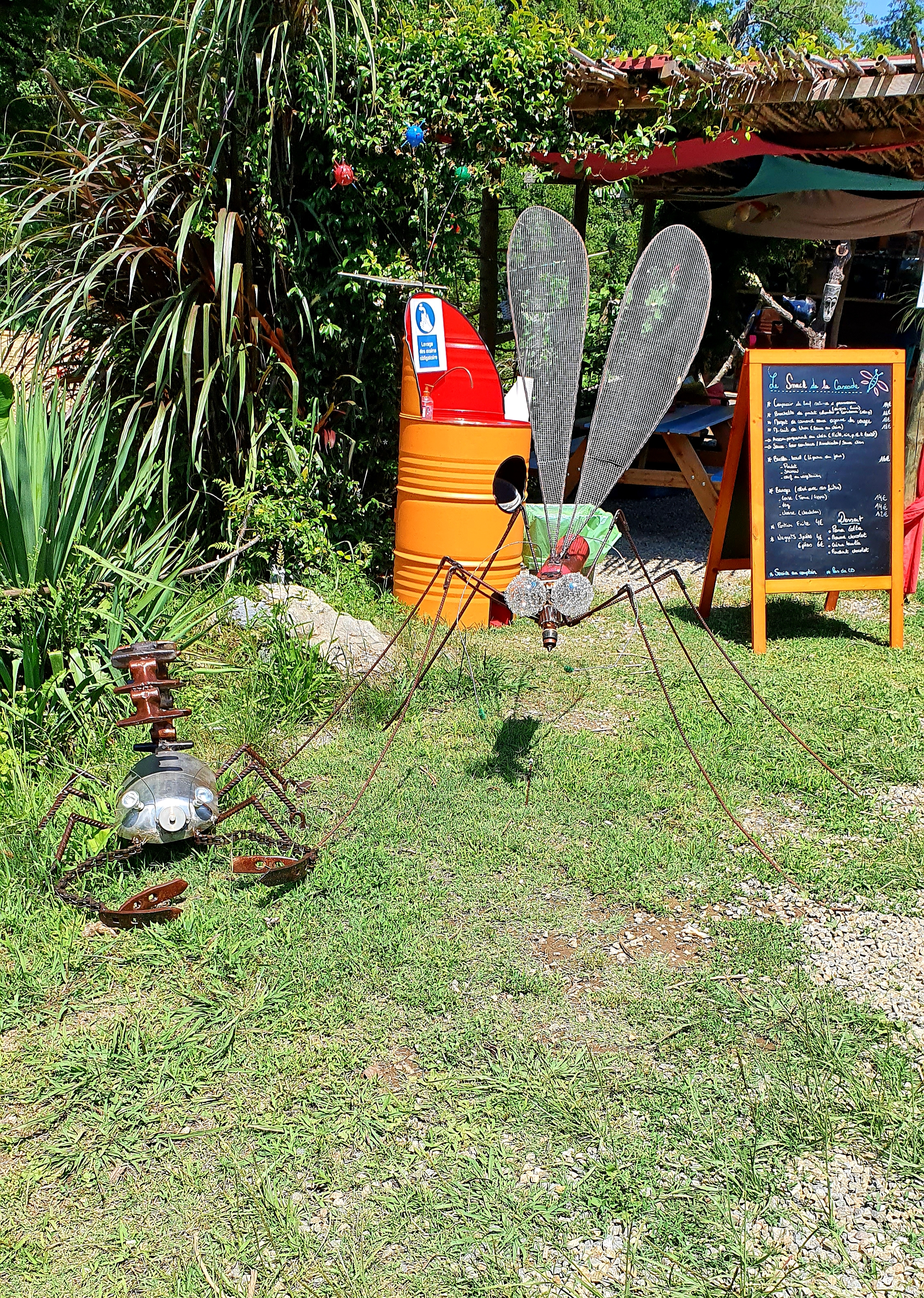 Pâtit snack atypique au bord de la rivière , ombragé grâce à de beaux arbres ,installation de tables chaises au bord de l'eau,calme et apaisant Le cuisto est un artiste : excellent repas ,créations déco avec matériaux de récupération