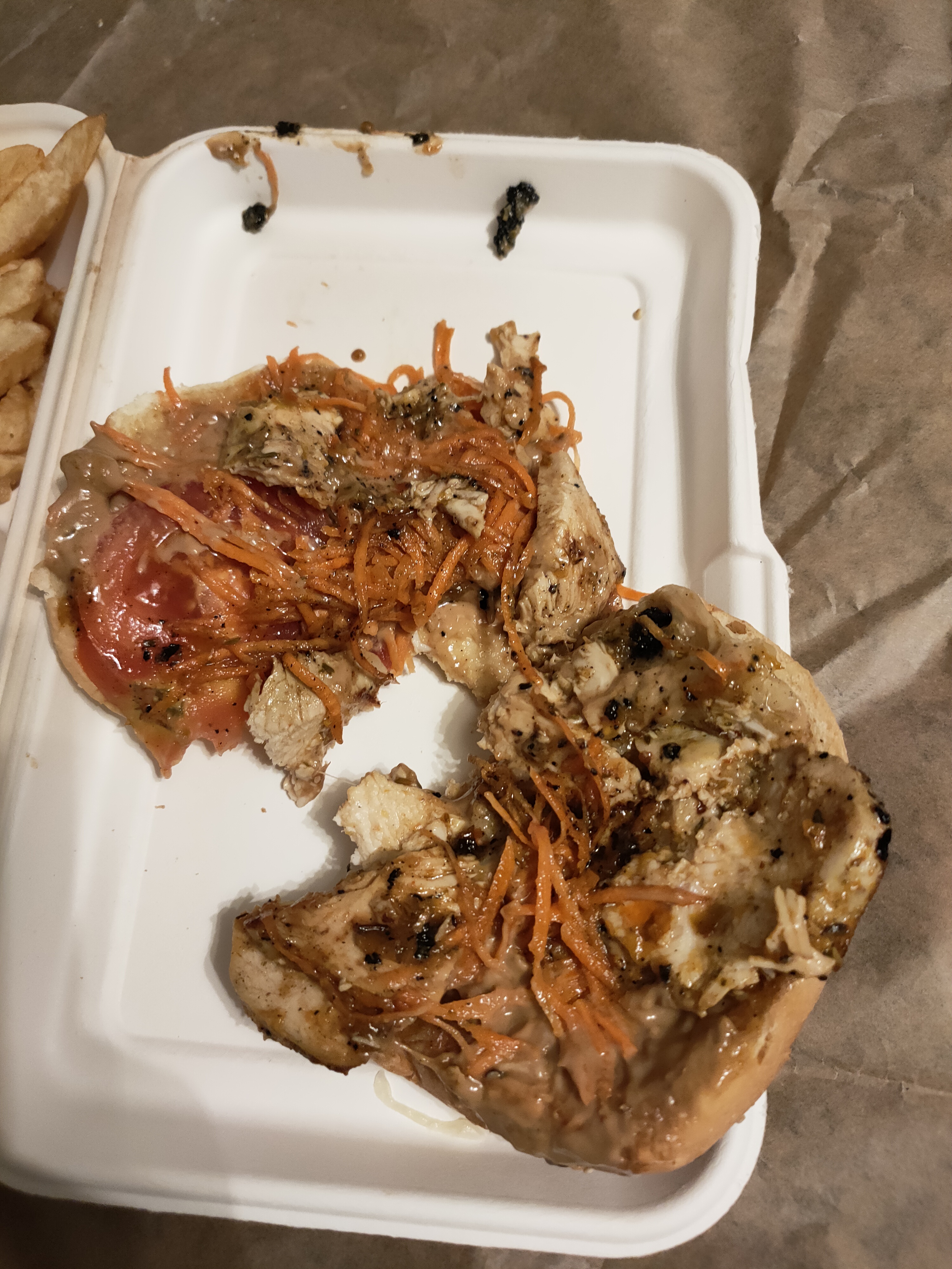 Vraiment déçus de ce que devient cette friterie, on vient a l'instant de venir prendre notre repas, des gros morceaux de carbonisé sont avec le poulet... Déjà en arrivant une petite odeur de cramé, et en le voyant cuire sur la plaque, qui était noire, je me suis dit oh non, et là a la maison, tout simplement immangeable. C'était notre dernière fois. Je suis navré de devoir mettre cet avis, mais il faut que les choses changent.