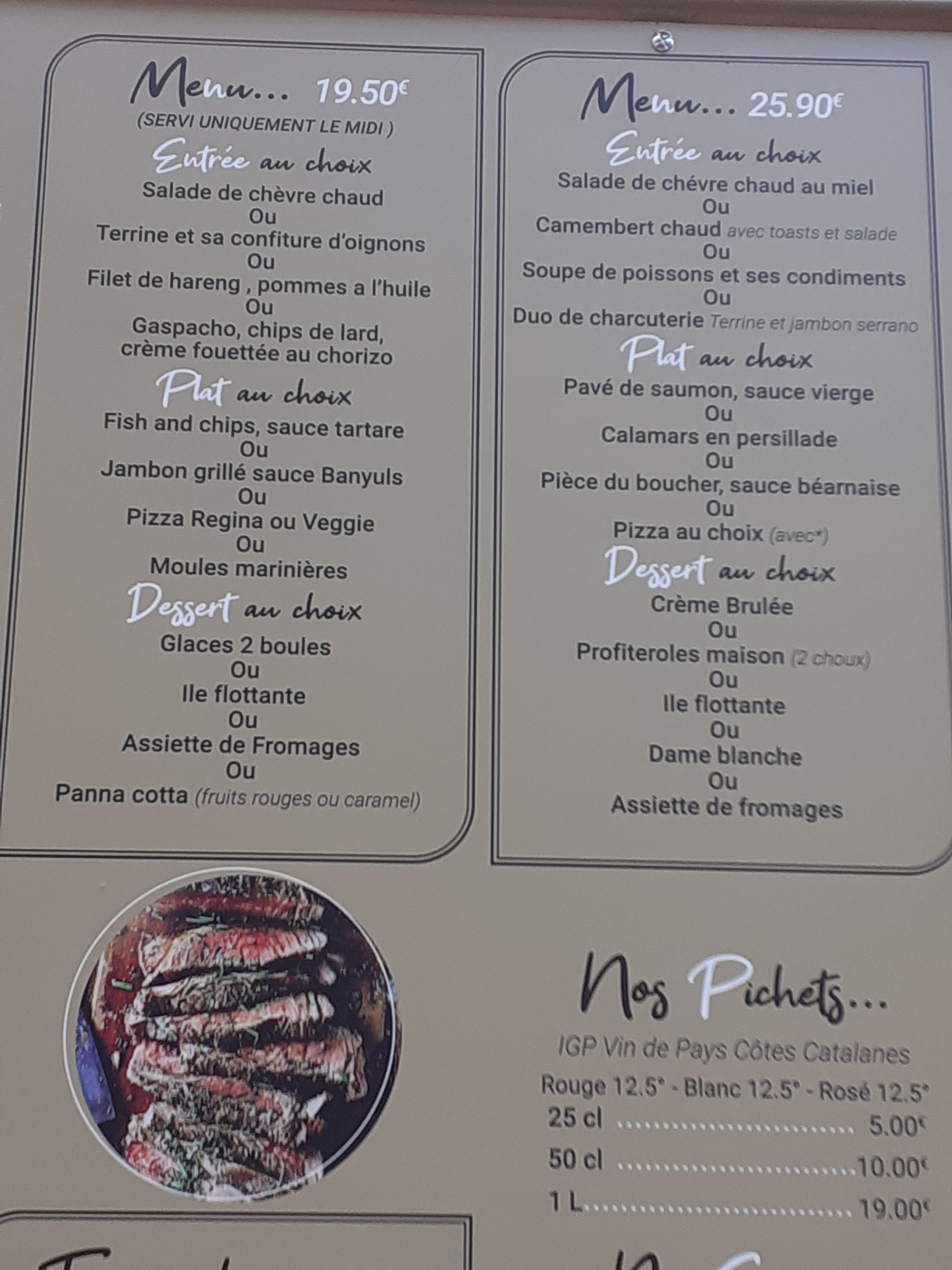 Restaurant correct, personel sympas,manque juste un peut de creme fraiche ds les galettes;-) et des sans ognions auss sinn la brunchetta tres bonne et la bolo pour les enfants tres bonnes egalement.Comme la plus part des restau de Argeles j encourage a prendre plus de tikets restau bravo 👍👍👍👍