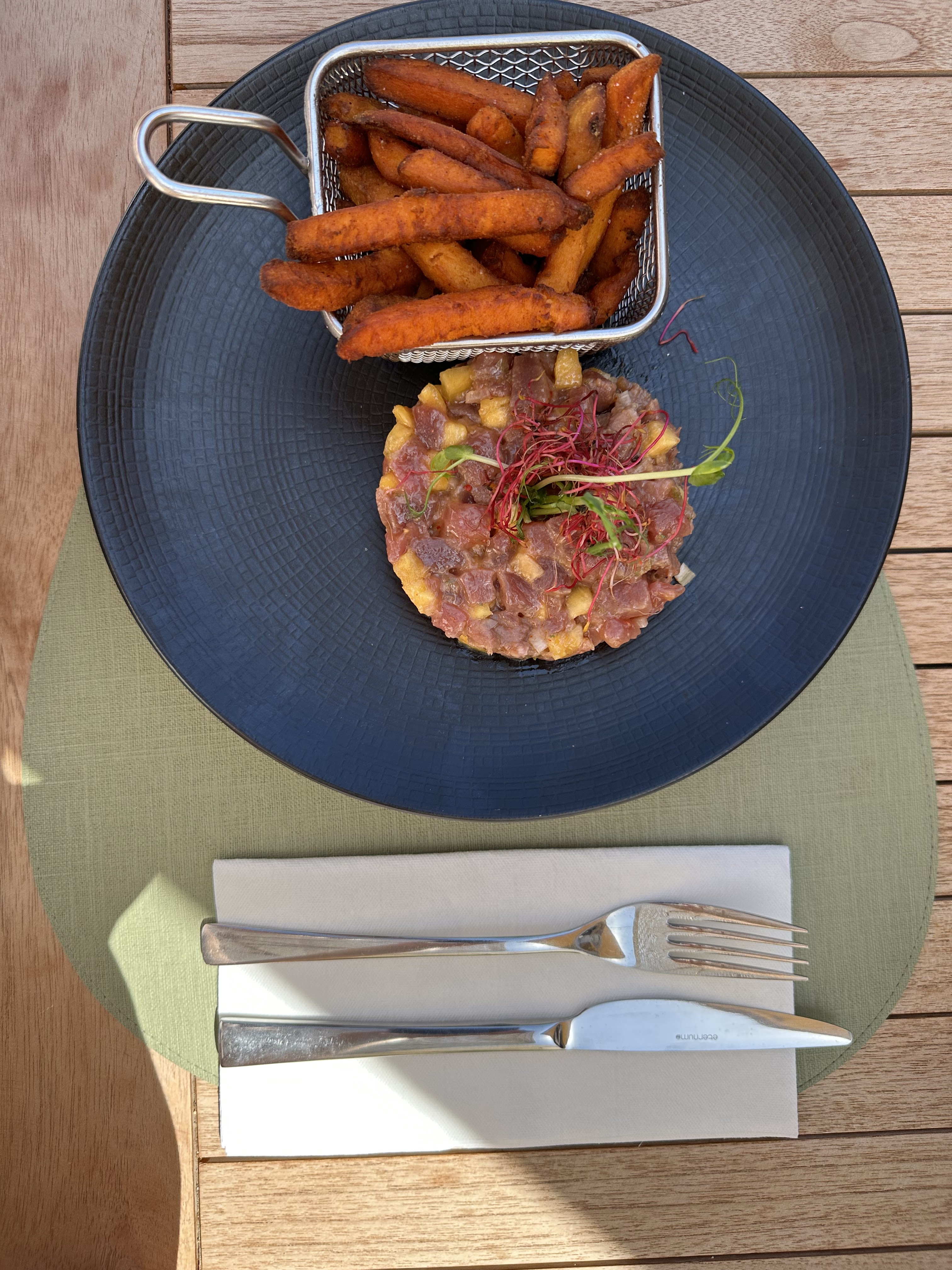 J'ai mis un peu de temps à me décider pour donner mon avis. Certaines critiques, acerbes et sans doute justifiées, ne sont pas en corrélation avec mon ressenti, c'est ce qui me motive à laisser un avis. Nous avons excellemment bien déjeuner, le poisson frais pêché et très bien cuisiné était excellent, et le tartare de thon pris par ma compagne était excellent (je l'ai goûté dans l'assiette de ma compagne) et suffisamment copieux pour ne pas ressortir avec la faim comme cité dans un autre commentaire, là ... j'ai beaucoup de mal à comprendre cette critique négative concernant le quantitatif !!! Pour nous, ce fût un très agréable repas et moment passé dans un cadre magnifique. Pour conclure, je recommande.