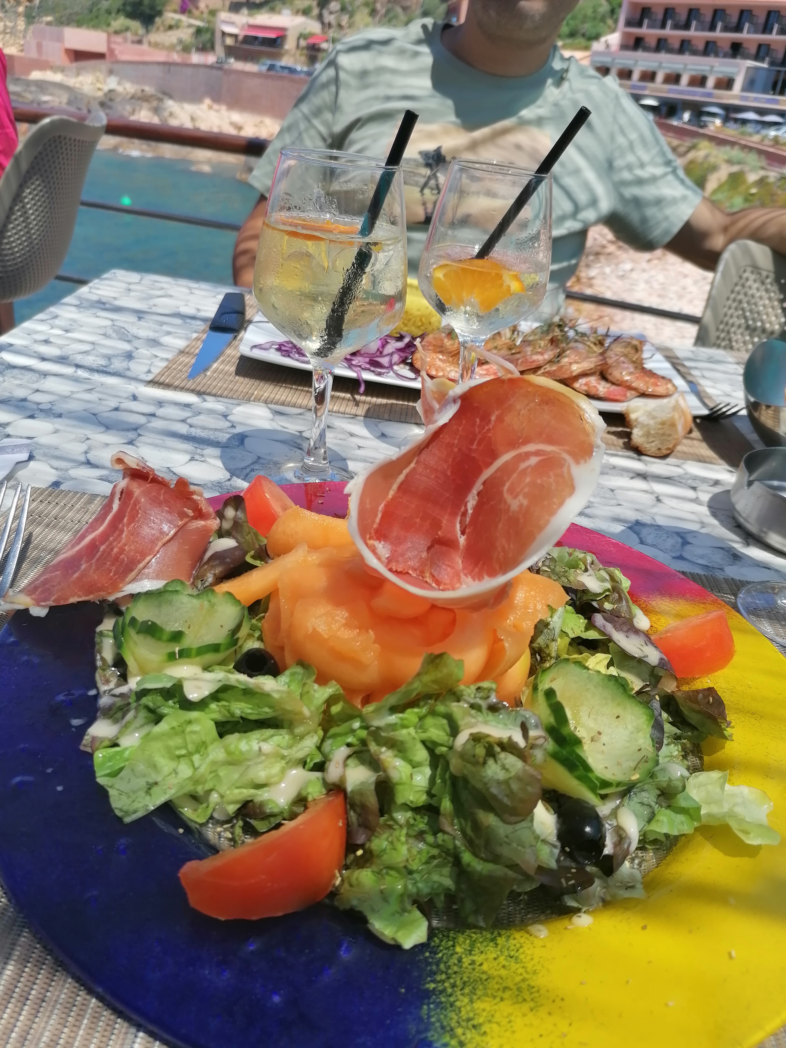 Superbe terrasse avec vue sur la mer. Le filet de loup et ses légumes ainsi que l'assiette de Gambas étaient très bonnes, Bon prix