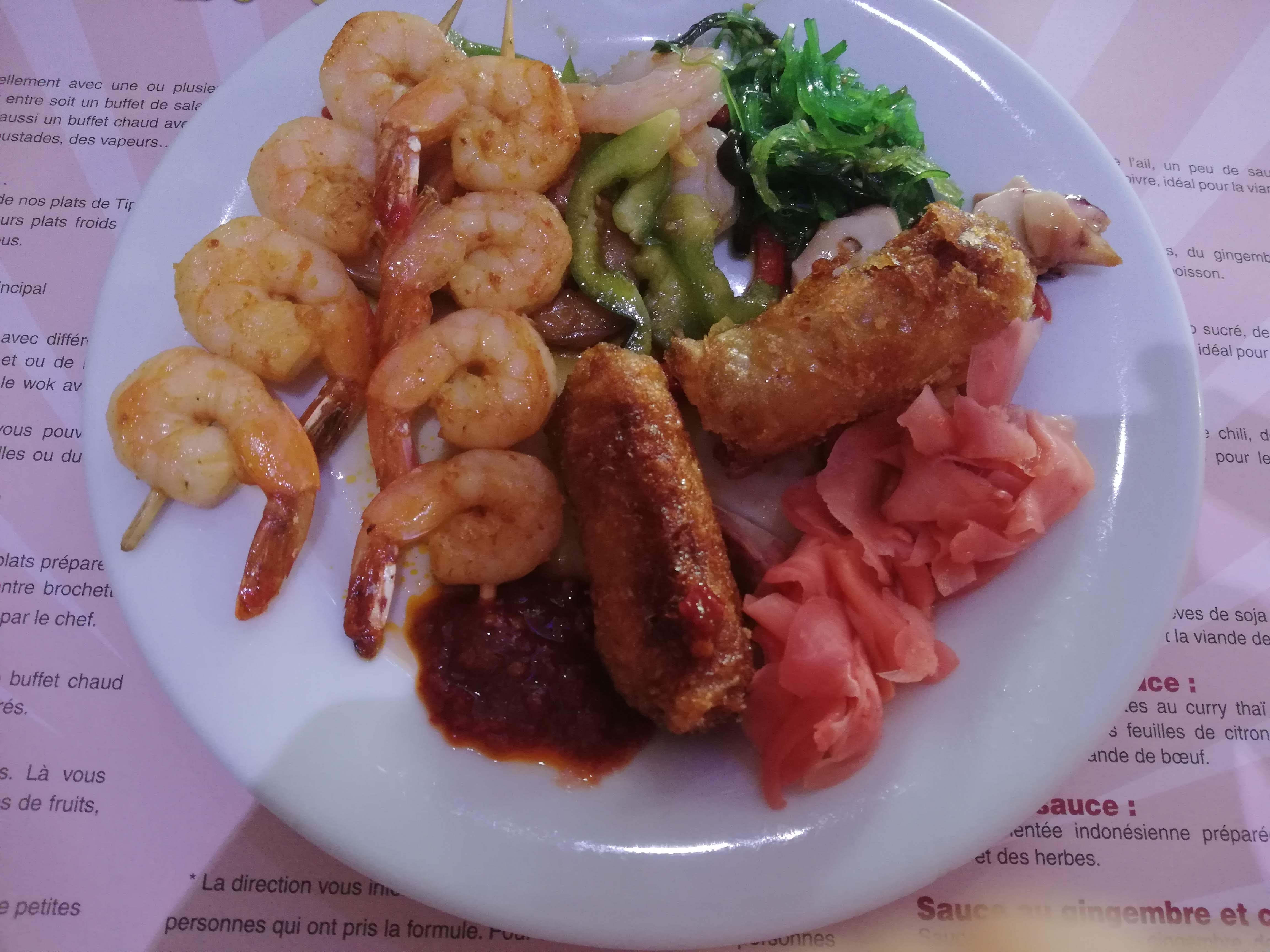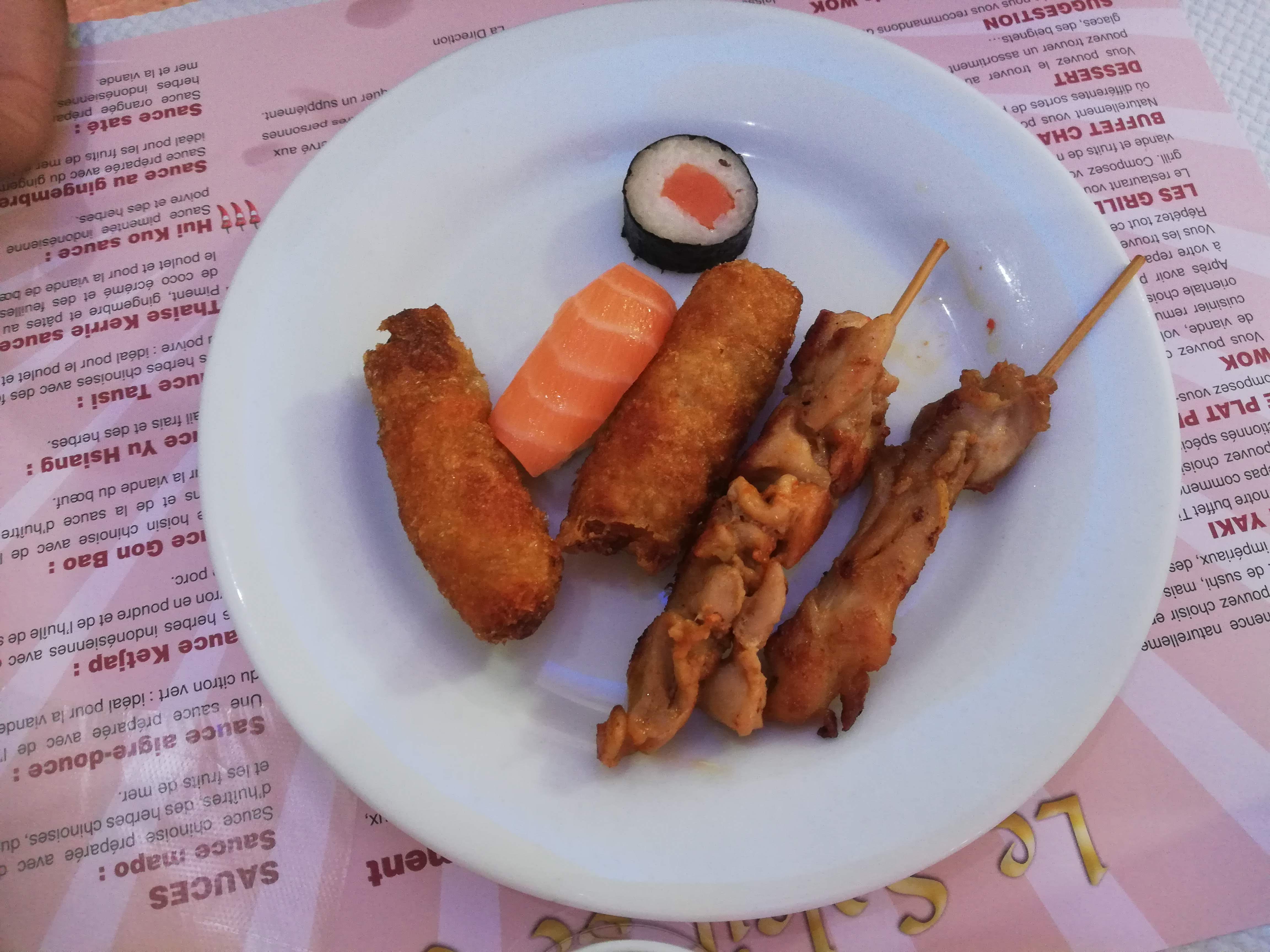 Plats et wok Excellent !!! Nous y sommes allé à 2 un lundi midi, menu à volonté à 13€50. J’ai goûté un p’tit peu de tout … et tout est très bon.