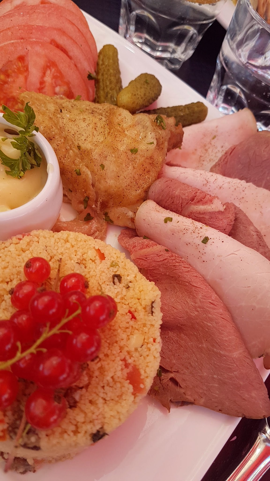 Piètre qualité. Poulet servi trop cuit, très sec . Pas de pain ni de sauce comme proposé. L'assiette est quand même à 19,50€. Bien décevant tout ça !