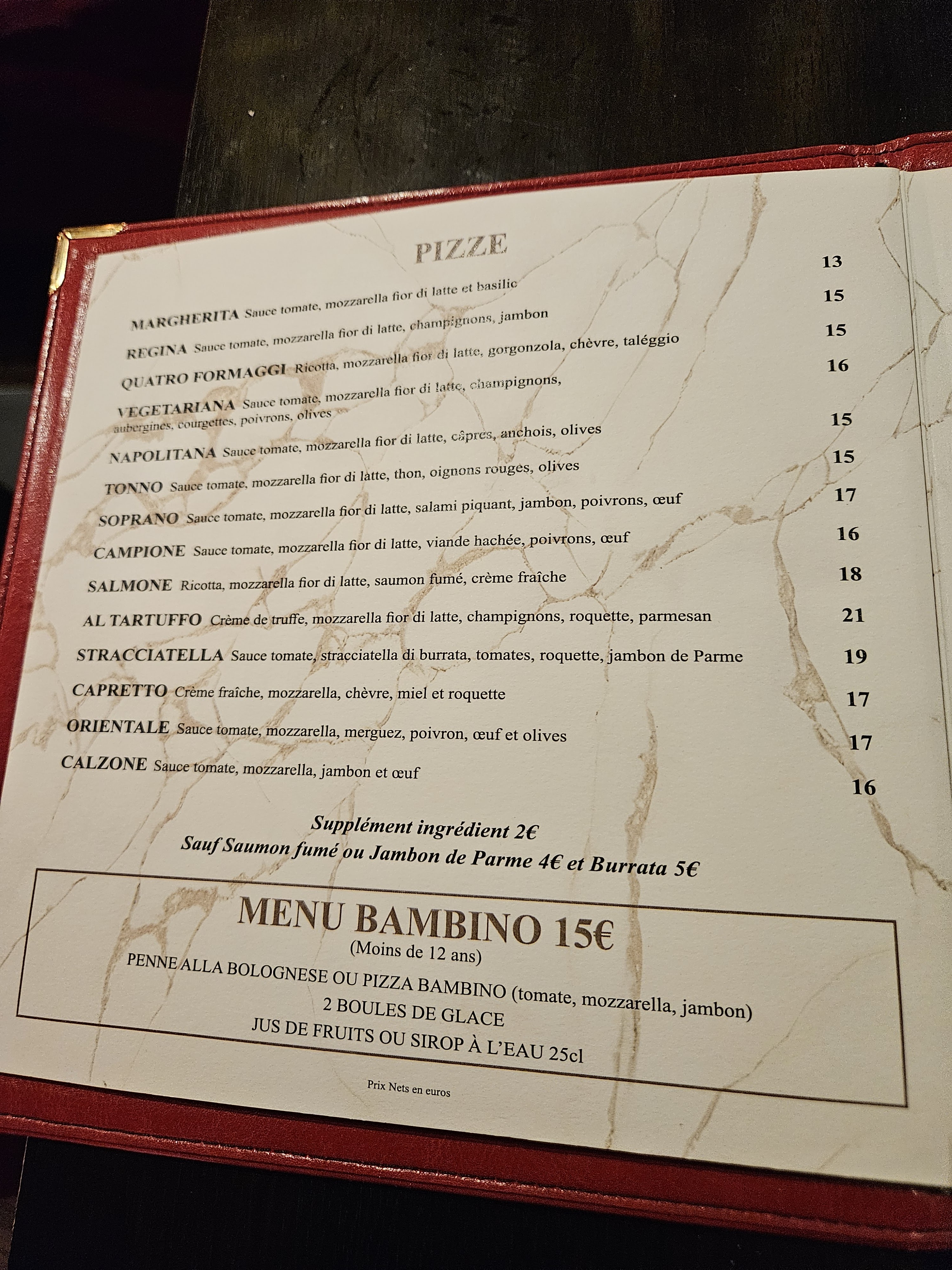 Après deux erreurs concernant nos plats et sans prévenir dans la carte que la truffe est cuisinée avec de l’alcool, nous avons finalement pris deux pizza trop cuites voire brûlées tandis que le goût n’y était pas. Nous avons aujourd’hui mal au ventre… Mauvaise expérience.