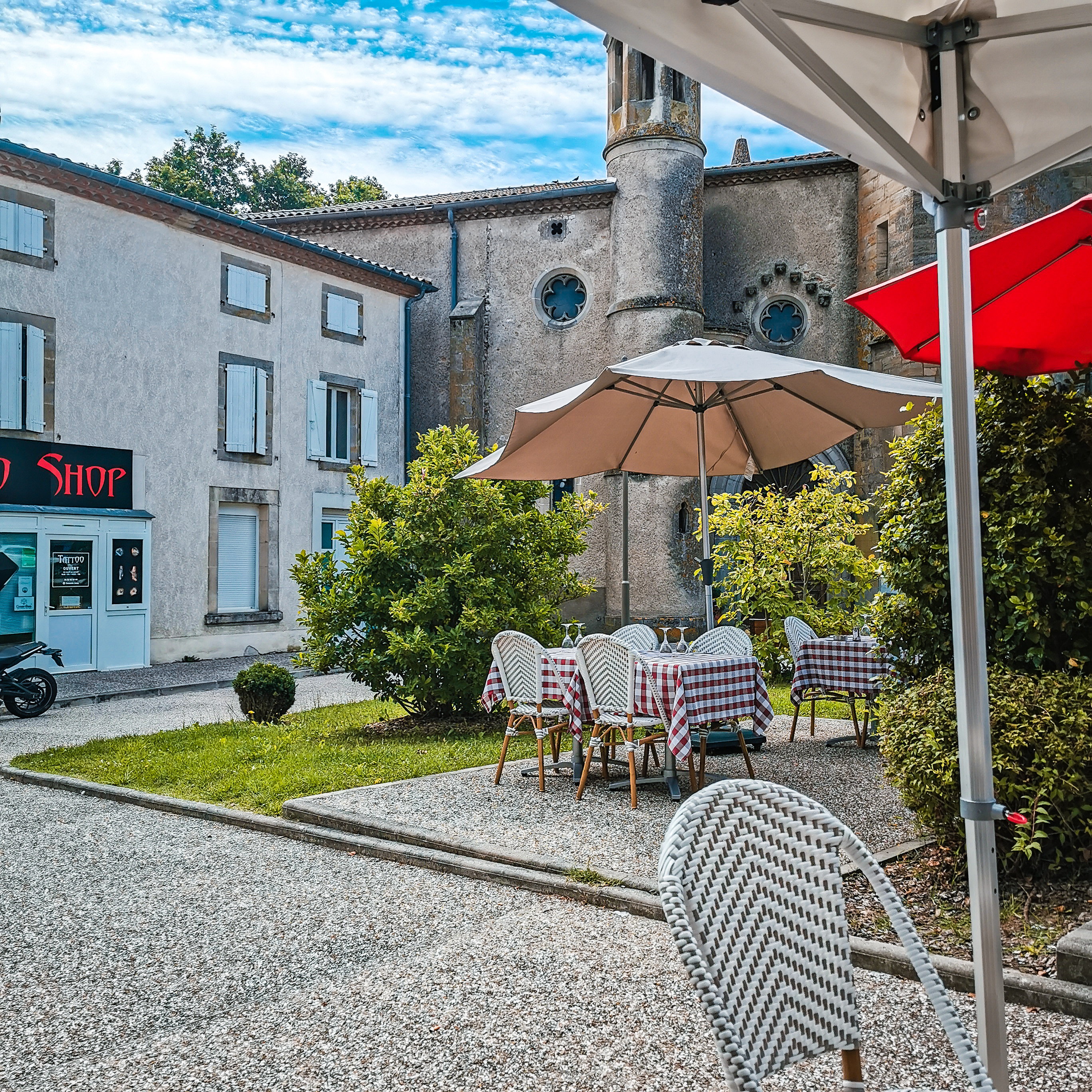 Restauration intérieure et extérieure face à une vielle église romane. Cuisine traditionnelle avec produits de qualité du terroir. Choix diversifiés chaque jour . Prix raisonnable repas complet à moins de 20€. Terrines Lapin aux herbes, requin, poulet, bœuf, légumes frais,fromages, desserts, vin ,café inclus. Accueil chaleureux. Vente repas à emporter. Parking à 30 m. Espace jeux et PMU.