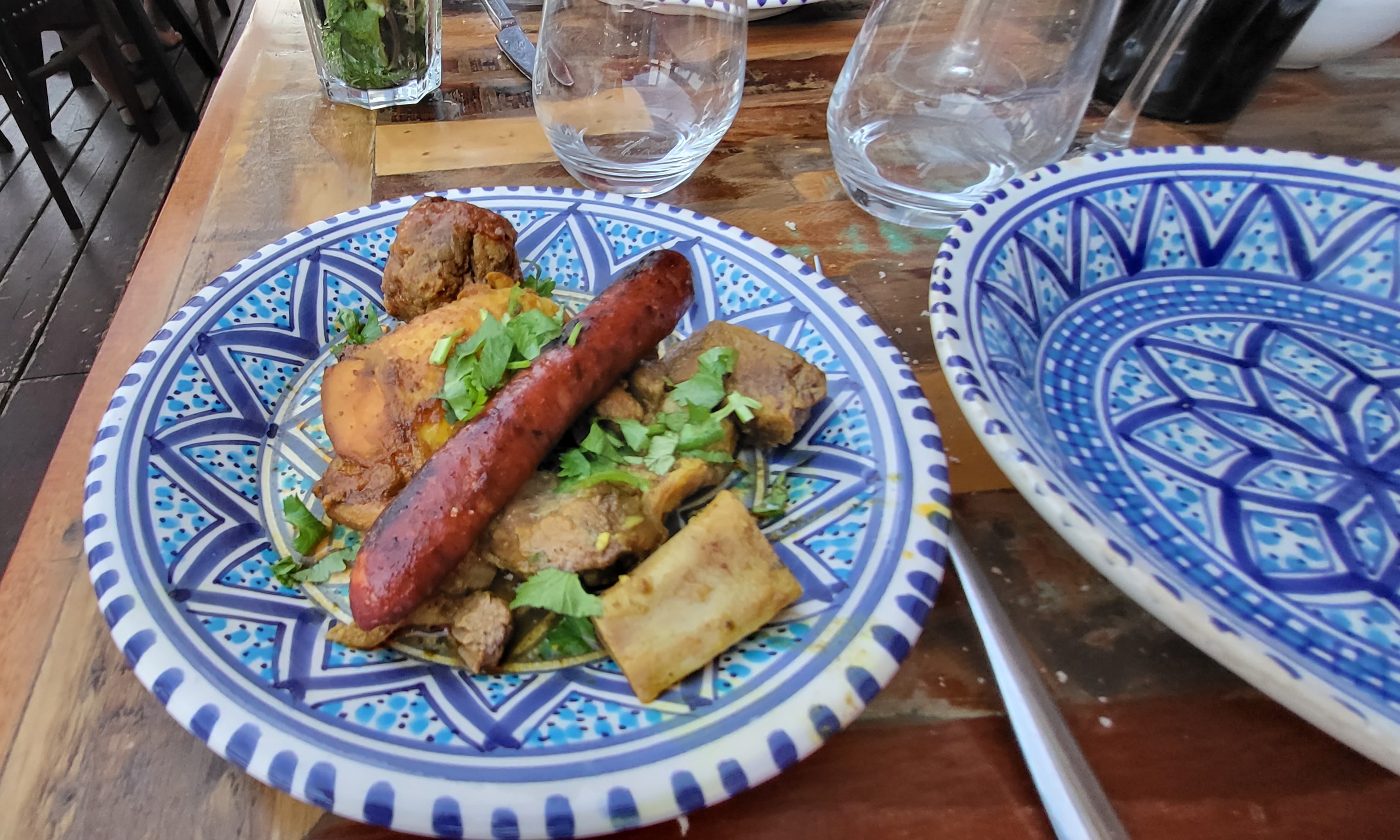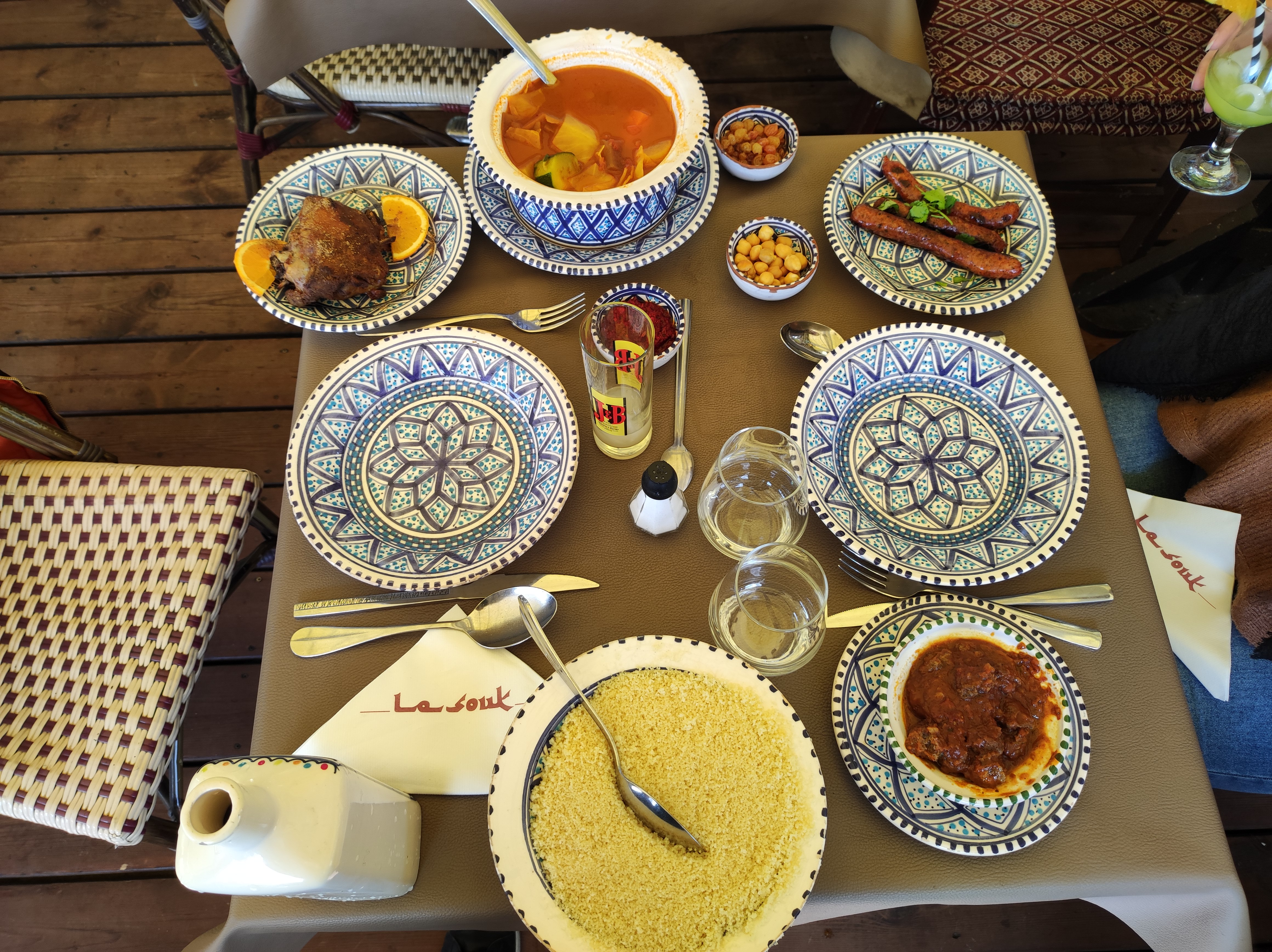 Situé le long du port, terrasse à disposition. Très bonne experience, entre la tajine d'agneau amandes et le couscous royal, mon coeur et mon palais penchent pour le couscous. La viande est bonne. Pas trop cuite. Comptez une vingtaine d'euros le plat. Bouillons et couscous à discrétion. Divers desserts(environ 9 euros, un peu cher) millefeuille figues, pastillas, orange cannelle. Pour ceux qui ont encore faim...