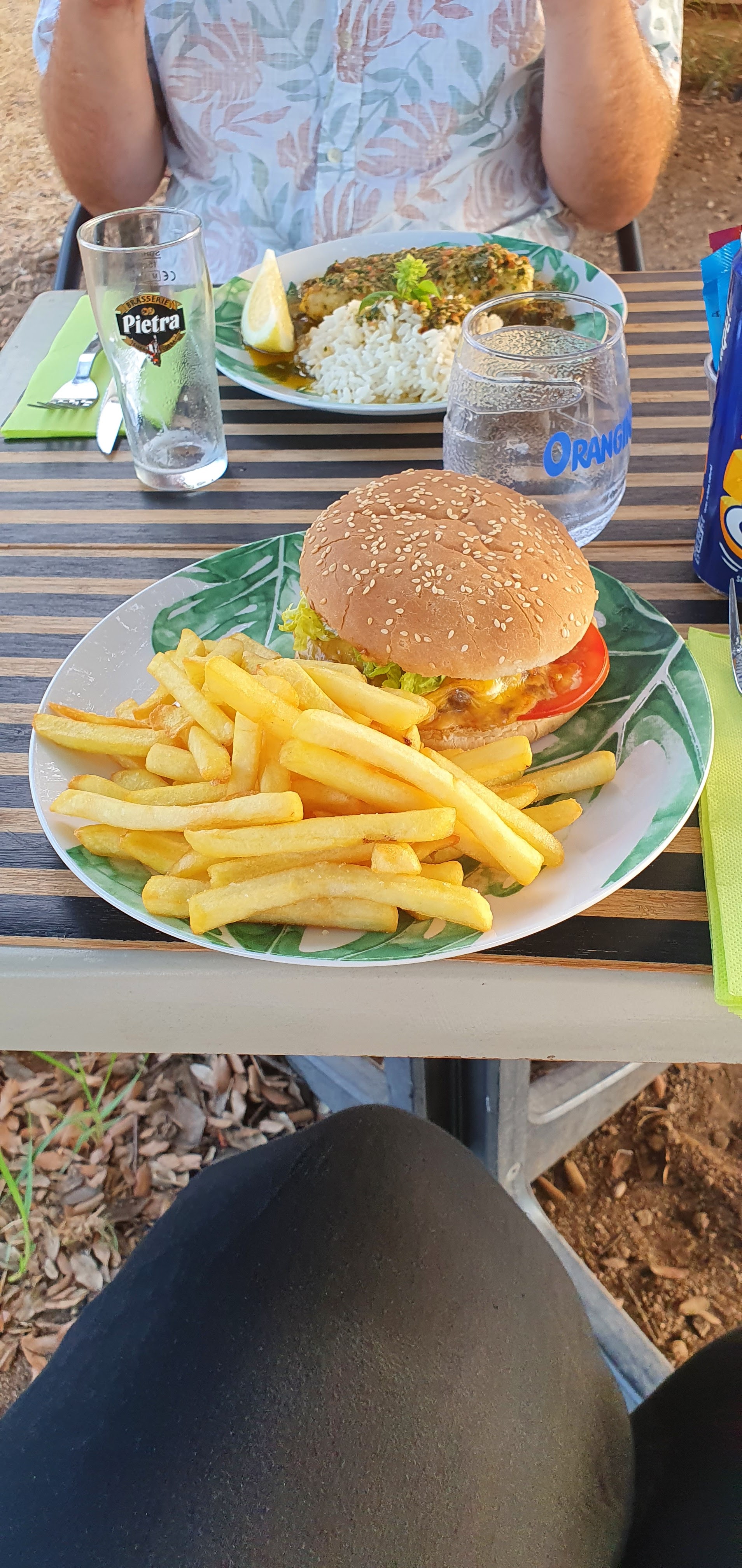 Charmant petit restaurant à Sant Ambroggio, nous nous sommes assis dehors sous un arbre, le restaurant ouvre à 19h30 (sauf le lundi et mardi soir et est fermé le mercredi je crois) et nous avons apprécié un repas en début de soirée (le soleil ne s'était pas encore couché donc non moustiques), la nourriture était délicieuse, nous avons eu un burger au fromage et des frites, un loup de poisson et du riz avec une sauce froide aux herbes, une crème brûlée et une flambée de pêche et d'abricot avec de la glace. C'était agréable et calme pour une soirée romantique !