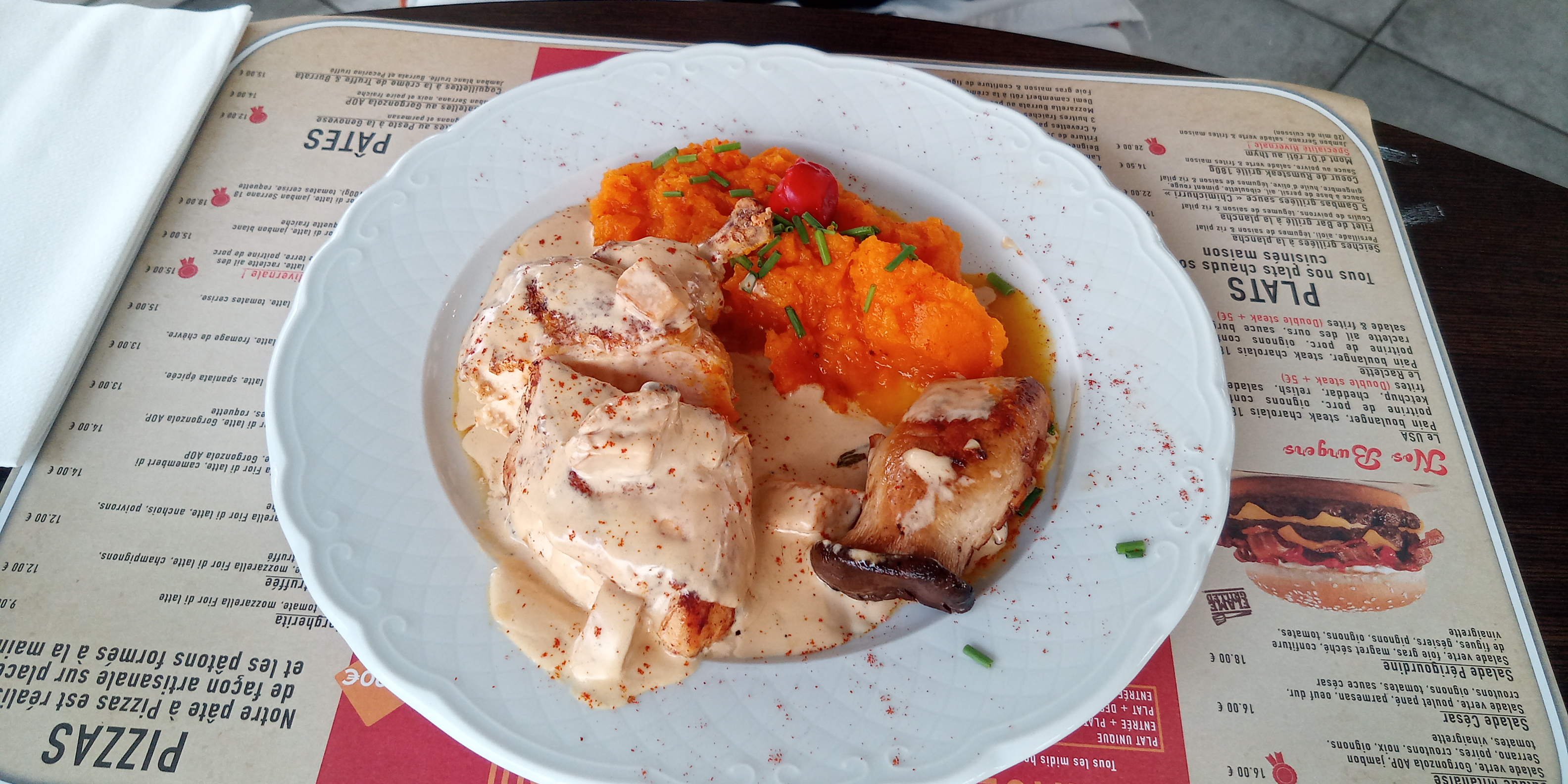 Très bonne accueil par le responsable des lieux qui a sus nous expliquer les changements ect, l'endroit est fleurie c'est vraiment jolie,en revanche les moules marinières étaient fade,l'entrecôte sauce gorgonzola avec des gros morceaux de poivre vraiment trop piquant ,six euro la RedBull bon facture de 93 euro pour deux menu enfants et deux menus et deux red bull,si j'avais bien manger pas grave la facture mais là je suis vraiment déçu.