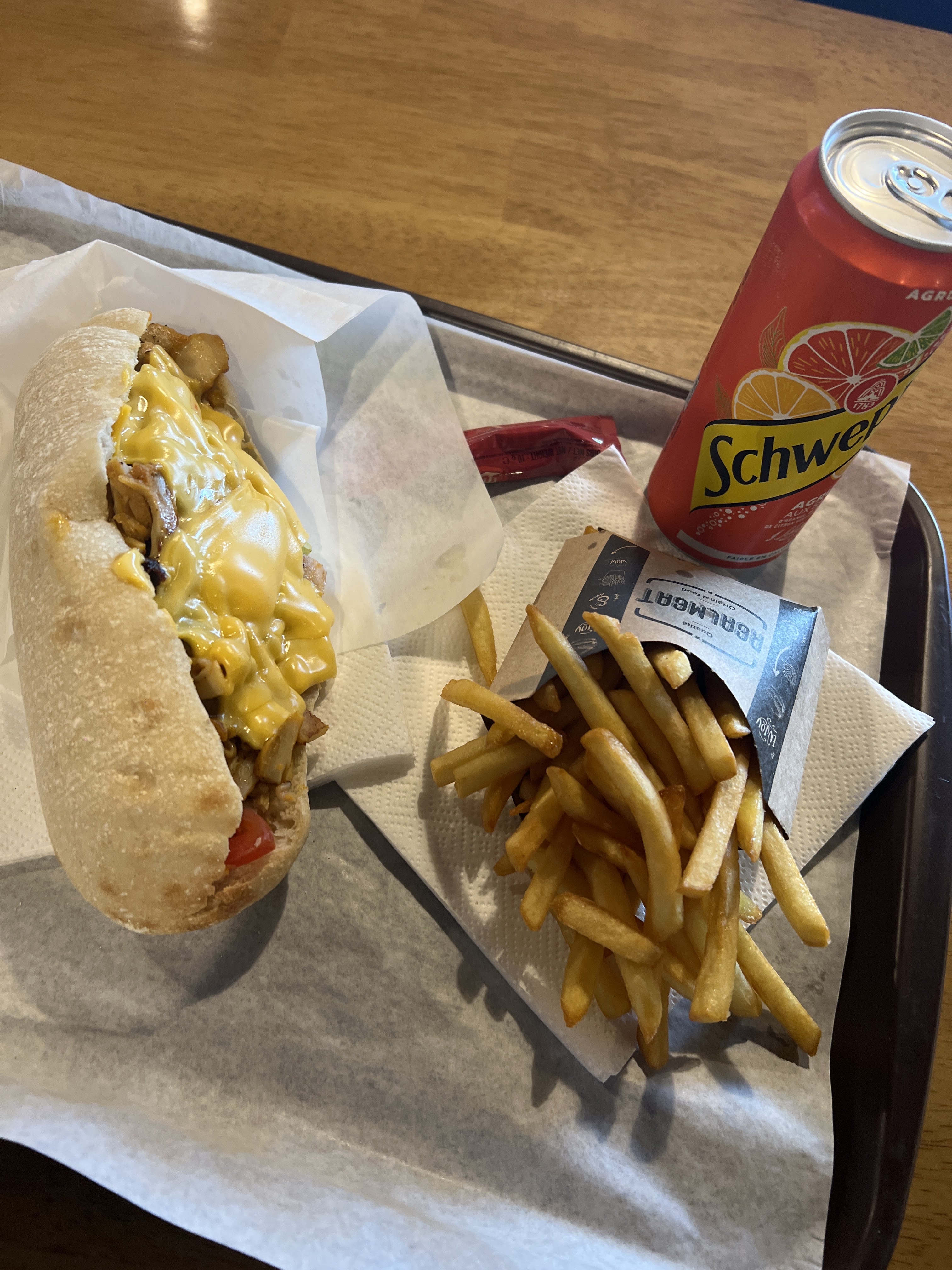 Sandwichs avec du goût et des bonne frites ,bonne pizzas personnel poli et sympa vous avez fait de petit effort sur la propreté continuez c'est très important (les tables le sol les toilettes et vers les vitres quelques toiles d arraigné) je sais que les clients sont pas très propre et on leur grande part de responsabilité pas évident avec un grand restaurant mais pour les clients c'est primordial et après vous serez nickel même mieux que McDonald's ou quick.