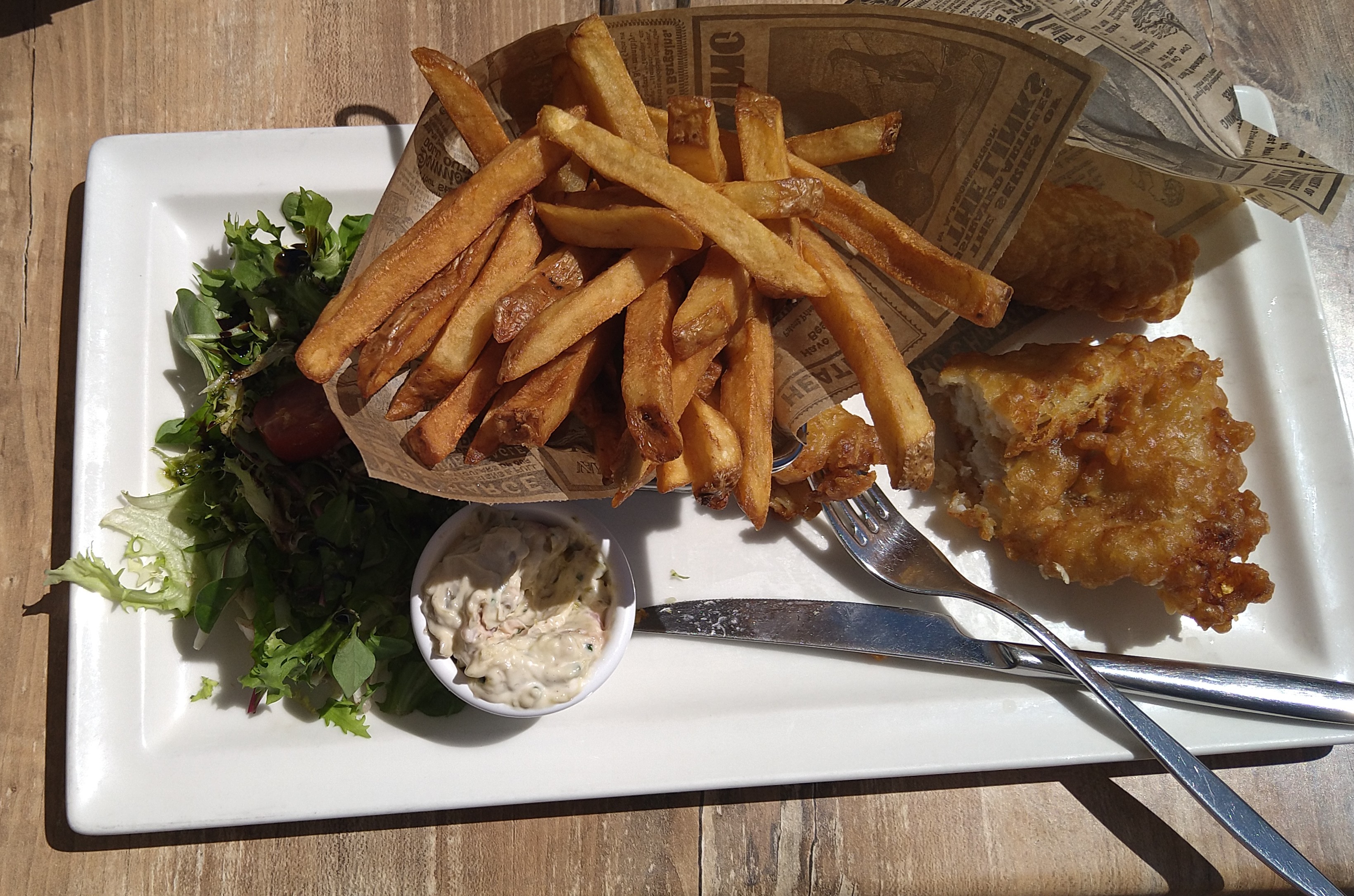Le fish and chips est à éviter vivement, chapelure plus proche de la pâte à choux, ni la pâte ni le poisson n'est assaisonné. Surprise de voir la présentation des boulettes au lieu du traditionnelle morceau de poisson. Innovation dont le client n'est pas averti et ça ne semble pas les choquer. Plus de chapelure que de poisson qui n'est pas fameux. Frite pas maison, la sauce tartare non plus. La salade qui accompagne le plat est bonne et on peut se demander ce que vient faire de la salade dans un poisson frite Aucun geste de compensation des gérants. Appartement selon l'endroit où on vit cela impact sur la perception de la qualité d'un plat, et même si on a testé plusieurs fish and chips dans Londres même et que l'on sait le goût que ça a la réponse du gérant ah mais c'est loin. Mauvaise foi absolu Pour ce plat je vous conseille d'aller à la cabane du pêcheur vers le chemin côtier. La qualité ne peut que y être meilleur.