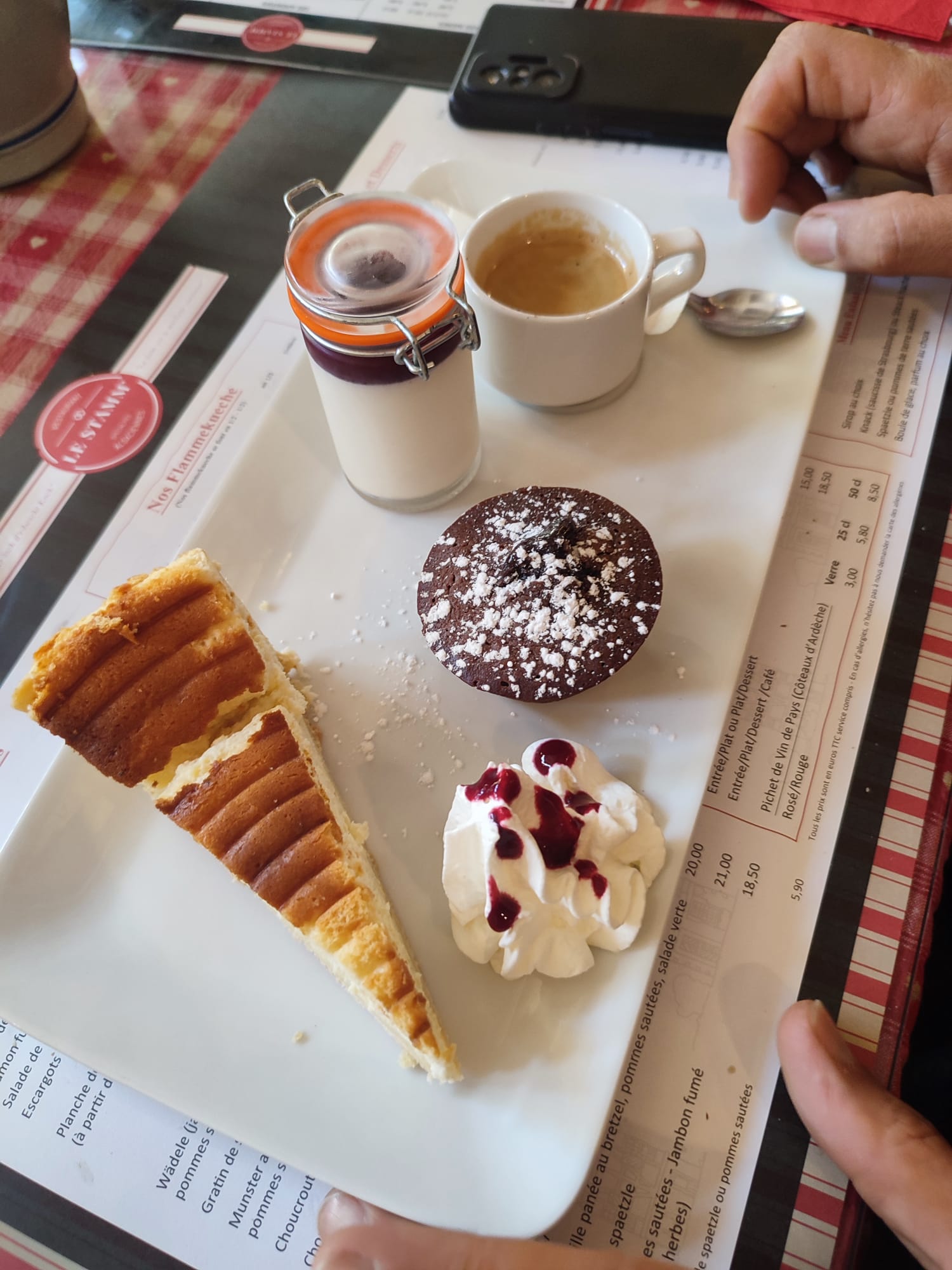 Des parts généreuses, on ne sait que choisir et on retourne en Alsace avec tous ses plats Un excellent moment et délicieux Je recommande, j'ai adoré