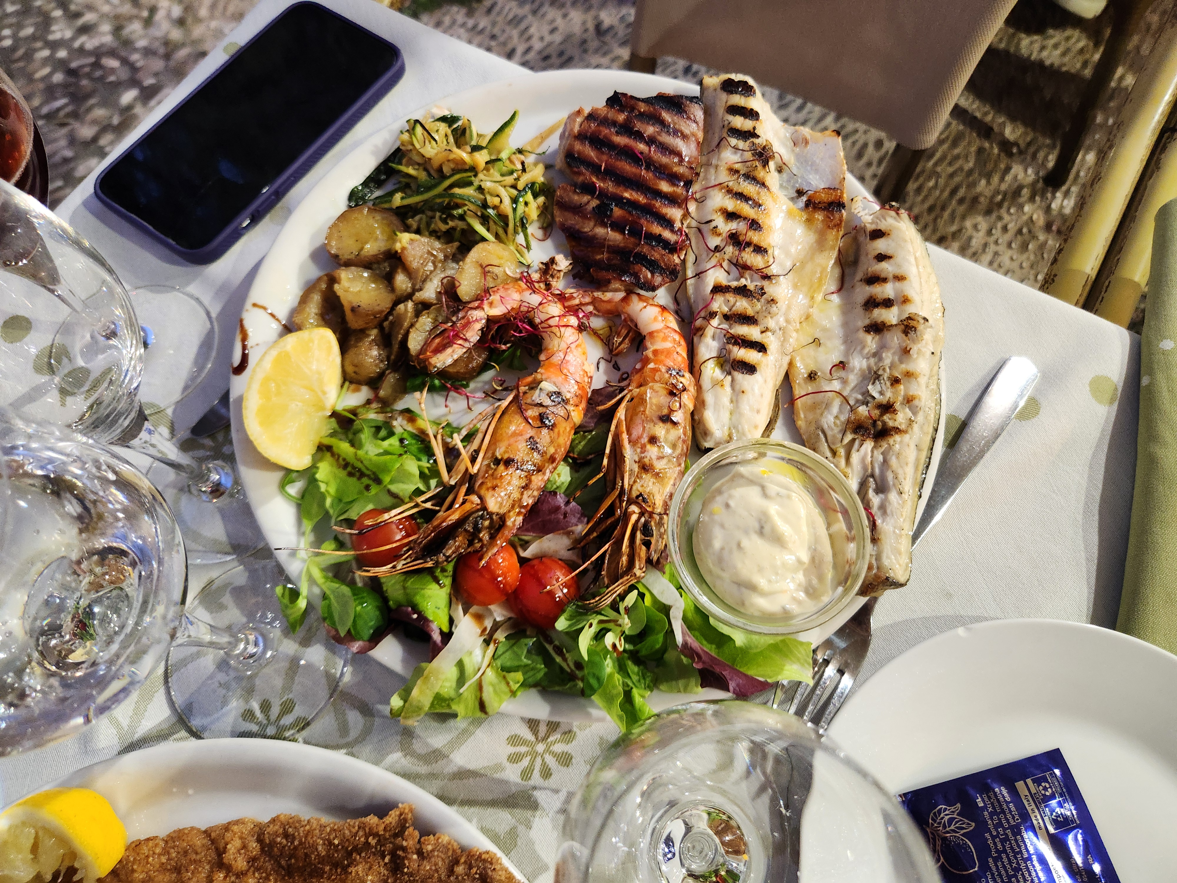 Le rapport qualité-prix de ce restaurant est décevant. Les prix sont assez élevés, pour une qualité très aléatoire. Cela commence mal dès le départ : un menu est affiché à l'extérieur et, dès qu'on est assis, on apprend que le menu n'est pas disponible et qu'il faut commander à la carte !!! L'assiette de fruits de mer était très bonne. Les gambas grillées étaient également très bonnes. En revanche, l'entrecôte grillée à 25 € fût une catastrophe : la tranche était très fine, mal cuite (pas du tout saisie) et beaucoup trop salée. A ce prix là, je m'attendais à beaucoup mieux. D'autre part, le vin rosé au pichet n'était pas du tout agréable à boire. En fin de repas, le patron nous a offert un granité au citron qui était très bon, ce qui a permis d'atténuer la mauvaise impression. Pour un excellent rapport qualité-prix, je vous conseille le restaurant Al Vecchio Forno qui se trouve un peu plus loin sur le front de mer.