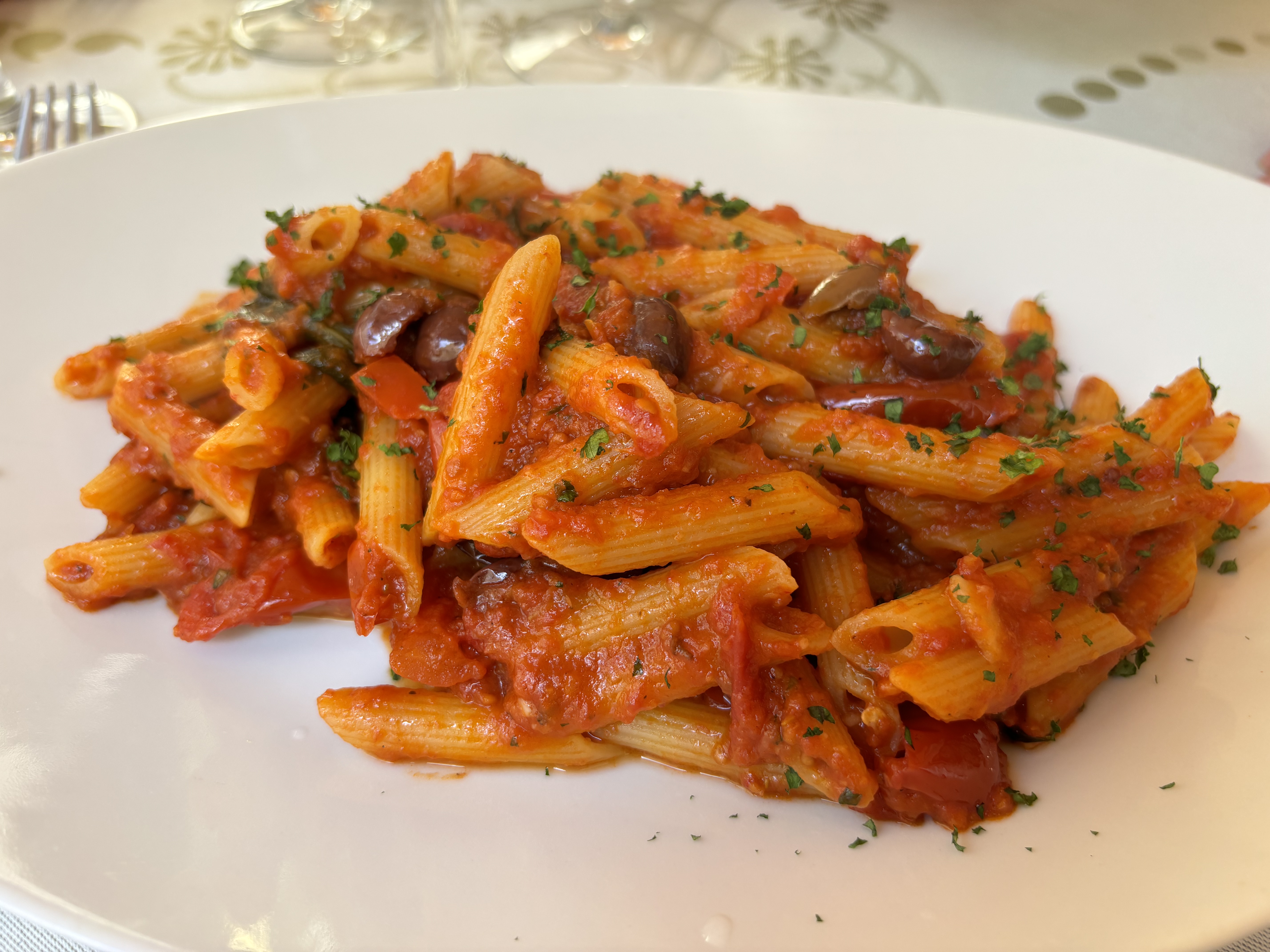 Pour 21€, en décembre, vous avez des penne all Arrabbiata (gloups!), mais si vous les voulez en version pâtes fraîches, c’est avec supplément de 2€ (méga gloups!). À côté de la frontière italienne, c’est quand même une grosse blague! Service obséquieux et envahissant, sauf une fois qu’on a payé l’addition où il n’y a soudainement plus de considération… Pour moins cher allez à Vintimille, on abusera moins de vous et vous n’aurez pas besoin de faire l’effort de comprendre les looooongs blablas des serveurs.