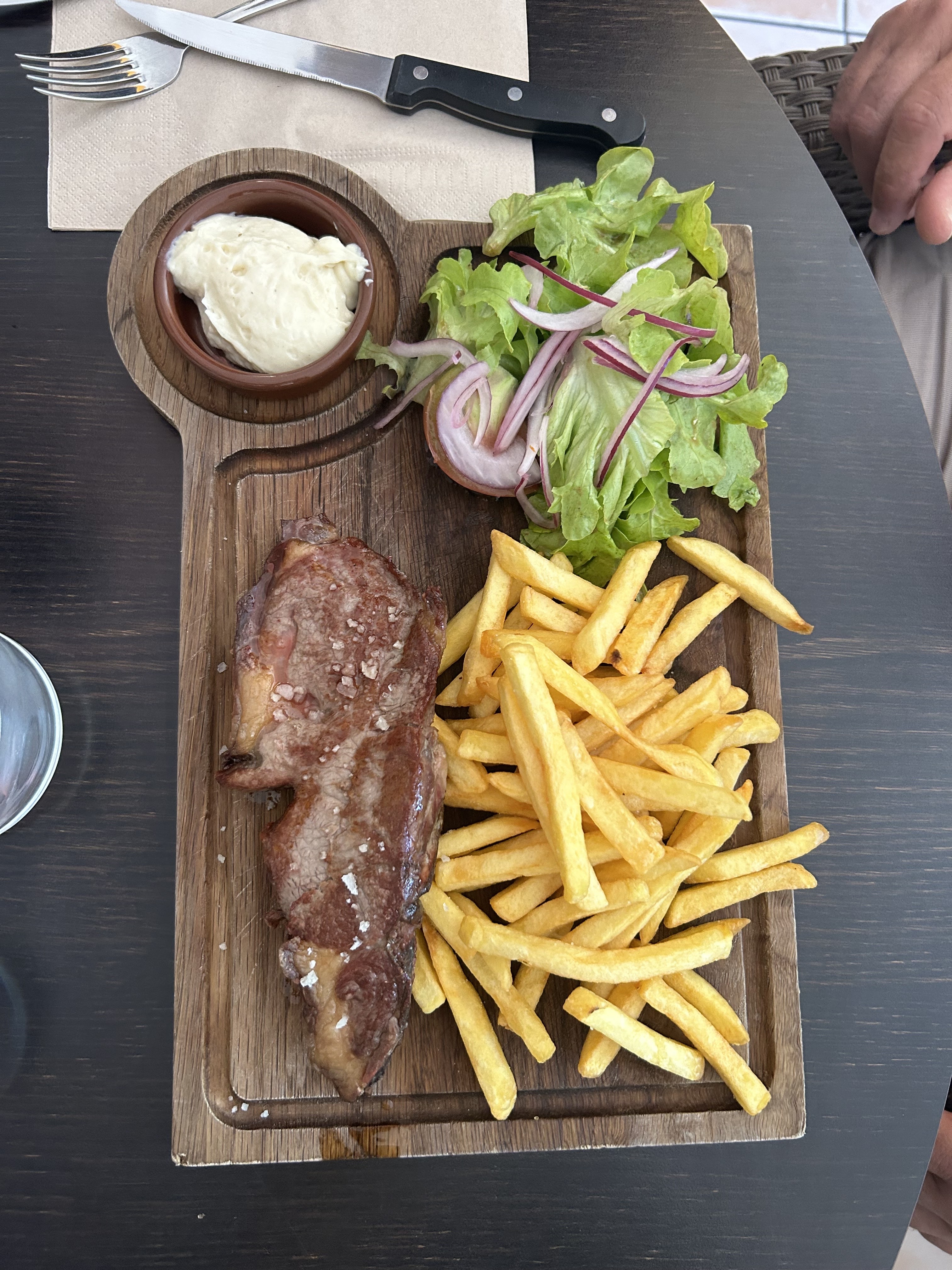 Super bien mangé. Très bon accueil malgré notre venue un peu tard 15h. Pour ma part c'était une salade césar bien garnie, ensuite 1 salade chèvre 🐐 chaud et pour finir servi sur sur 1 planche en bois une superbe entrecôte avec 1 sauce au gorgonzola avec des frites. Je recommande. Salle climatisée, propre et agréable. Bon service aussi. Nous aurons mes amis et moi l'occasion d'y retourner avec plaisir. Bonne continuation
