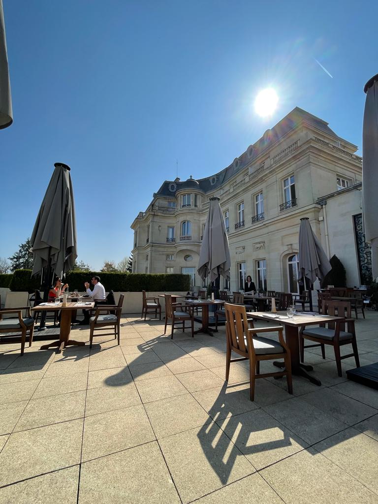 Nous nous sommes assis en terrasse par une journée ensoleillée. Les sièges extérieurs sont très agréables dans cet hôtel/château. La nourriture était bonne et le service était bon. Très belle expérience dans l'ensemble.