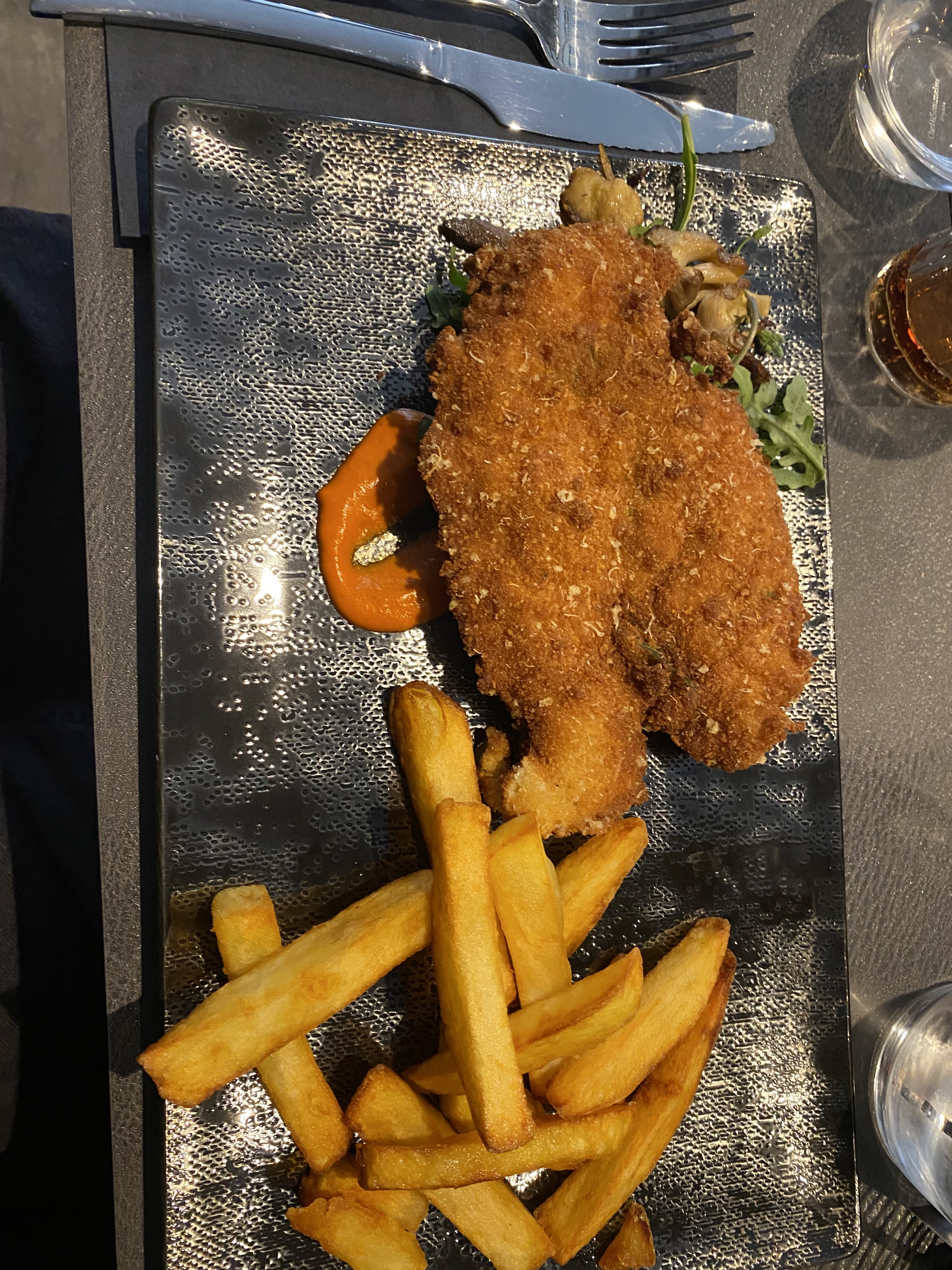 Frites pas cuite, pétillant sans bulle, apéritif servi en même temps que le repas.2em fois que l'ont y va pas de 3e