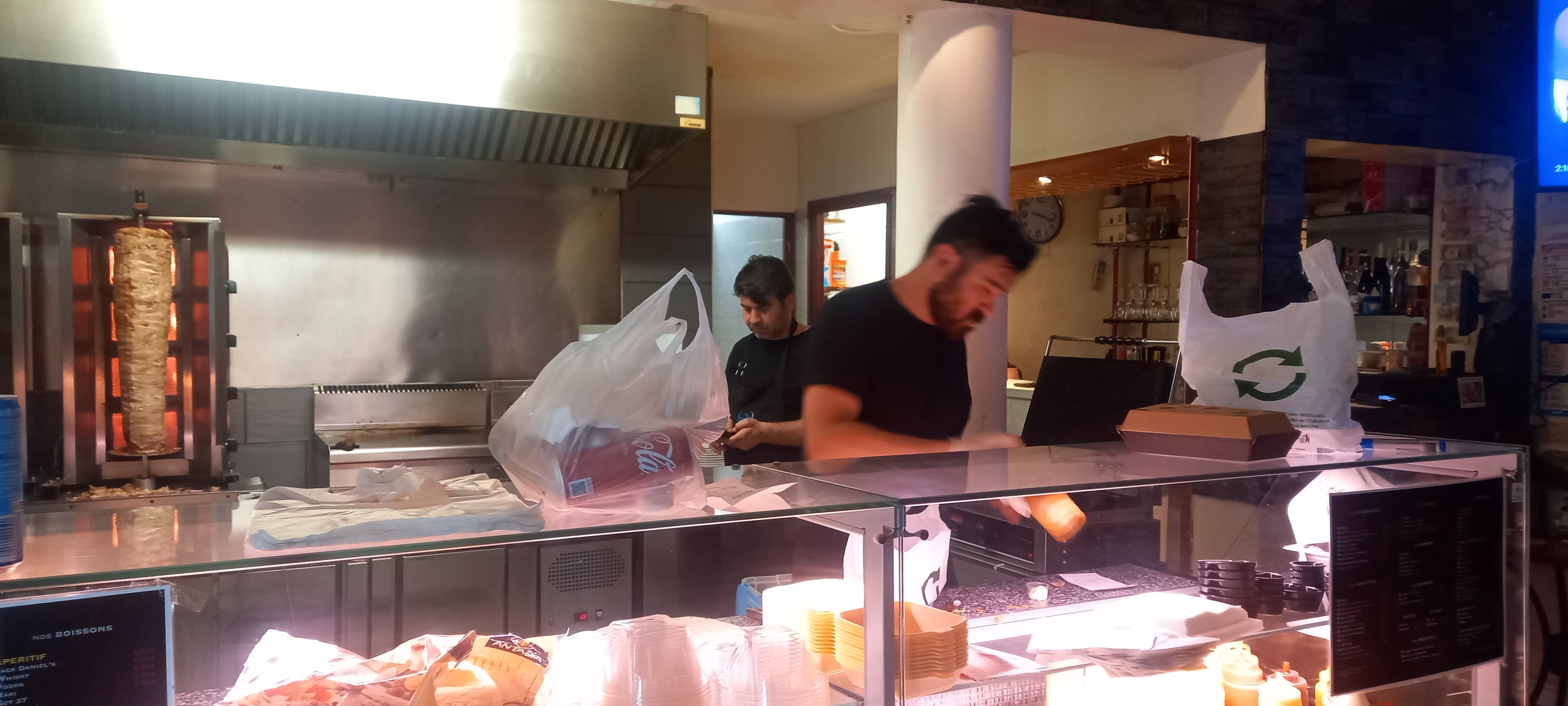 Rapide pour commande à emporter. Odeur de friture dans la salle de restaurant. Prix normal pour un kebab.
