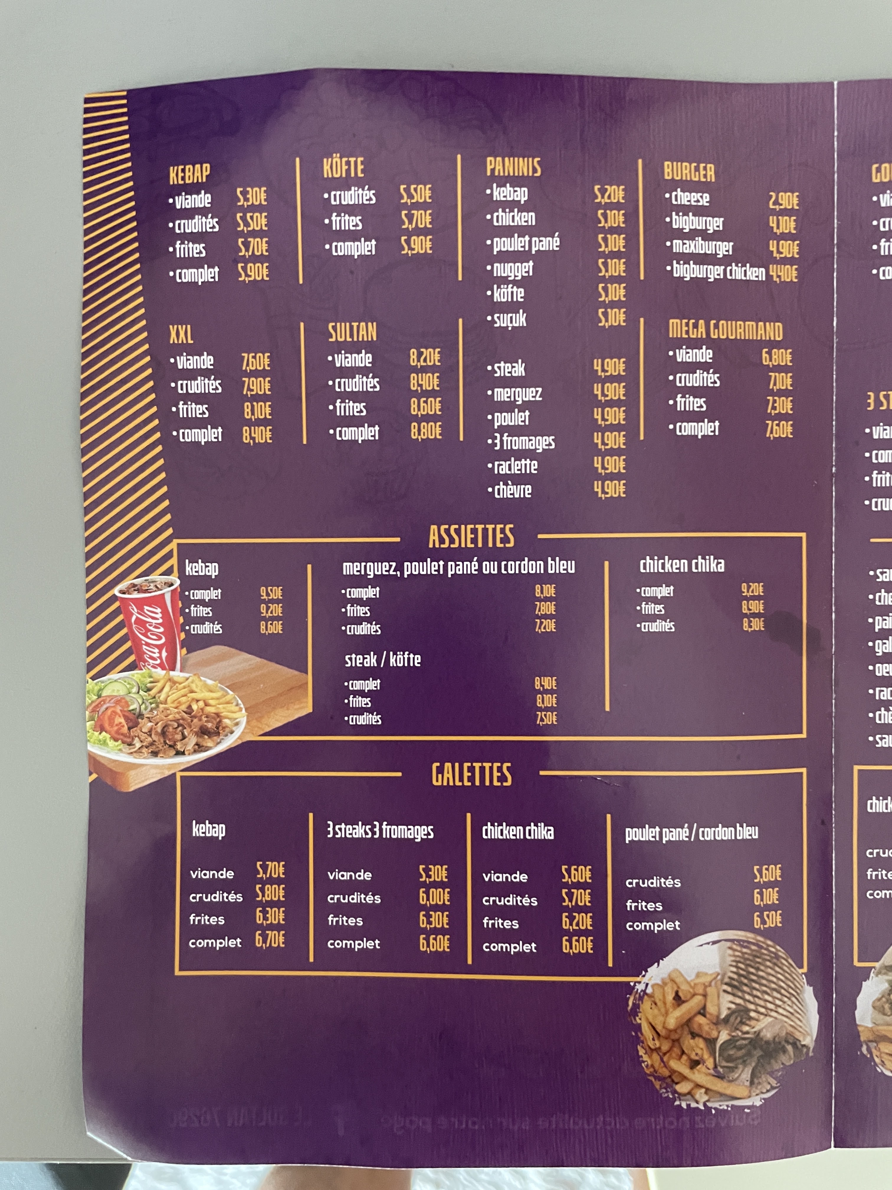 C'est trop chère la 1er fois je suis parti j'ai commandé une galette kebab complète avec canette il ma dit 8,10e pourtant sur la carte c'est 6,80e quand j'ai dit pk il ma dit en pain c'est moins cher la blague 2eme fois un double cheese qui a 4,10e sur la carte j'ai pris un le prix c'est 8,10e avec boissons c'est des voleurs c'est gens la au havre tu paye 6e un double cheese au marmara meilleur kebab et la galette complète est a 7,50e avec boisson je reviendrai plus chez ses voleurs la bandes de chien