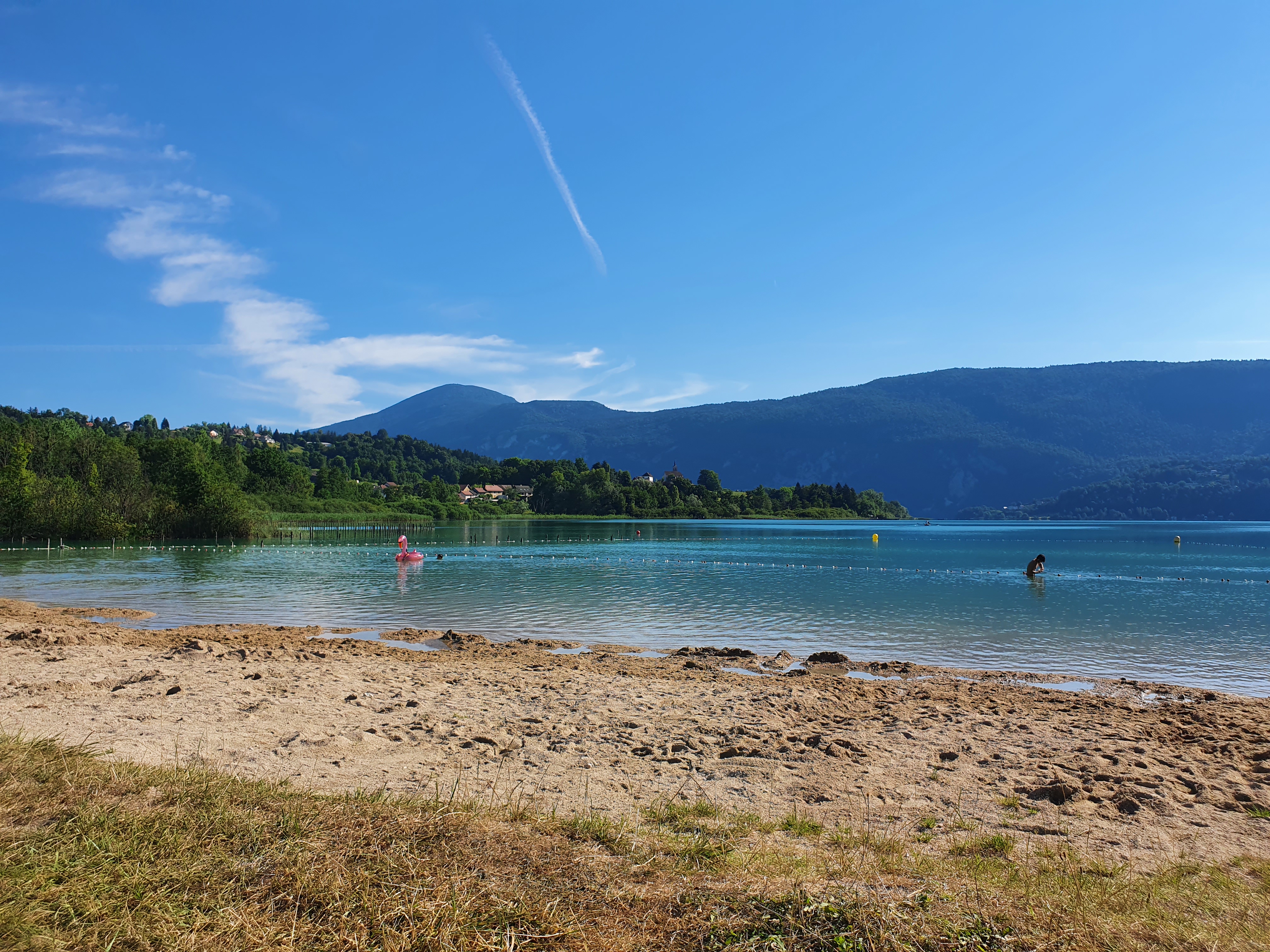 Très belle plage du lac d'Aiguebelette avec beaucoup d'espace, bar/resto, terrains de sport, aire de jeux, terrain de pétanque. L'eau est très belle, au même titre que la vue sur les montagnes ! 2,50€ l'entrée pour les adultes.