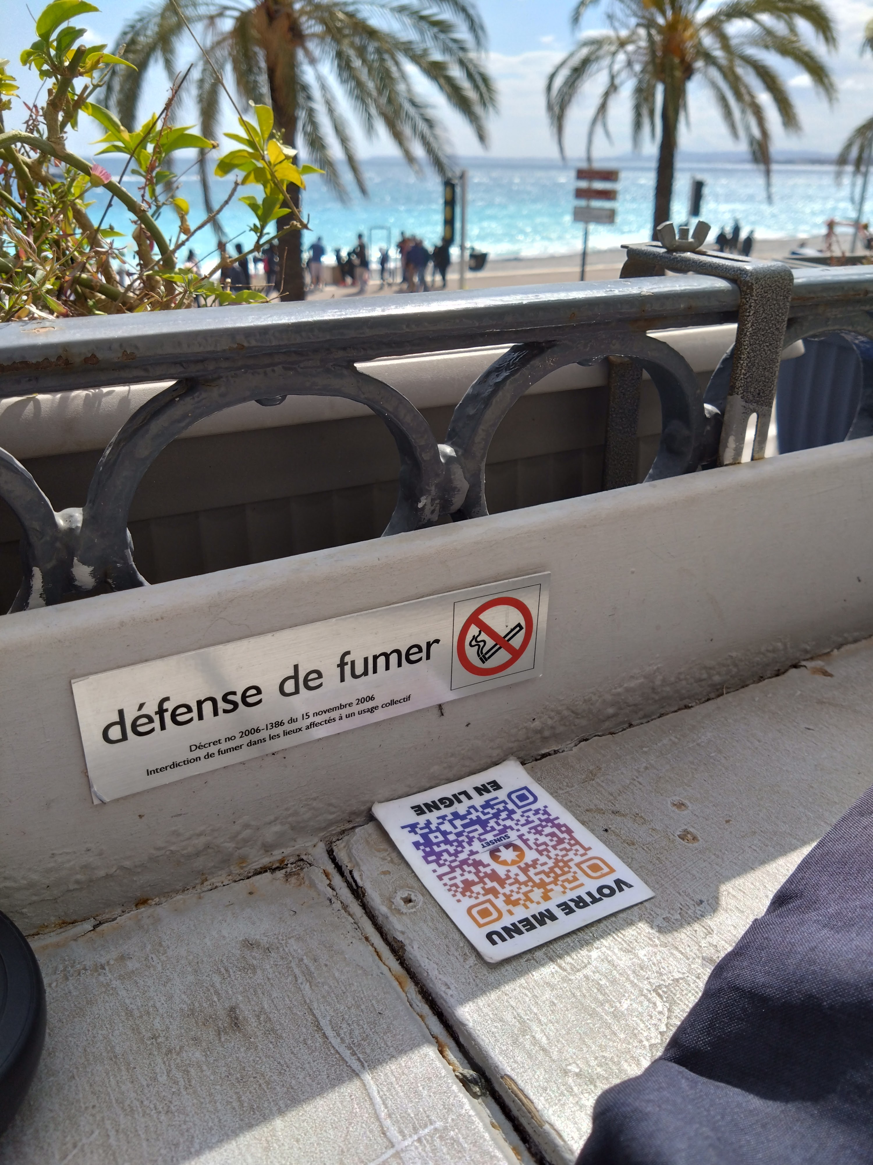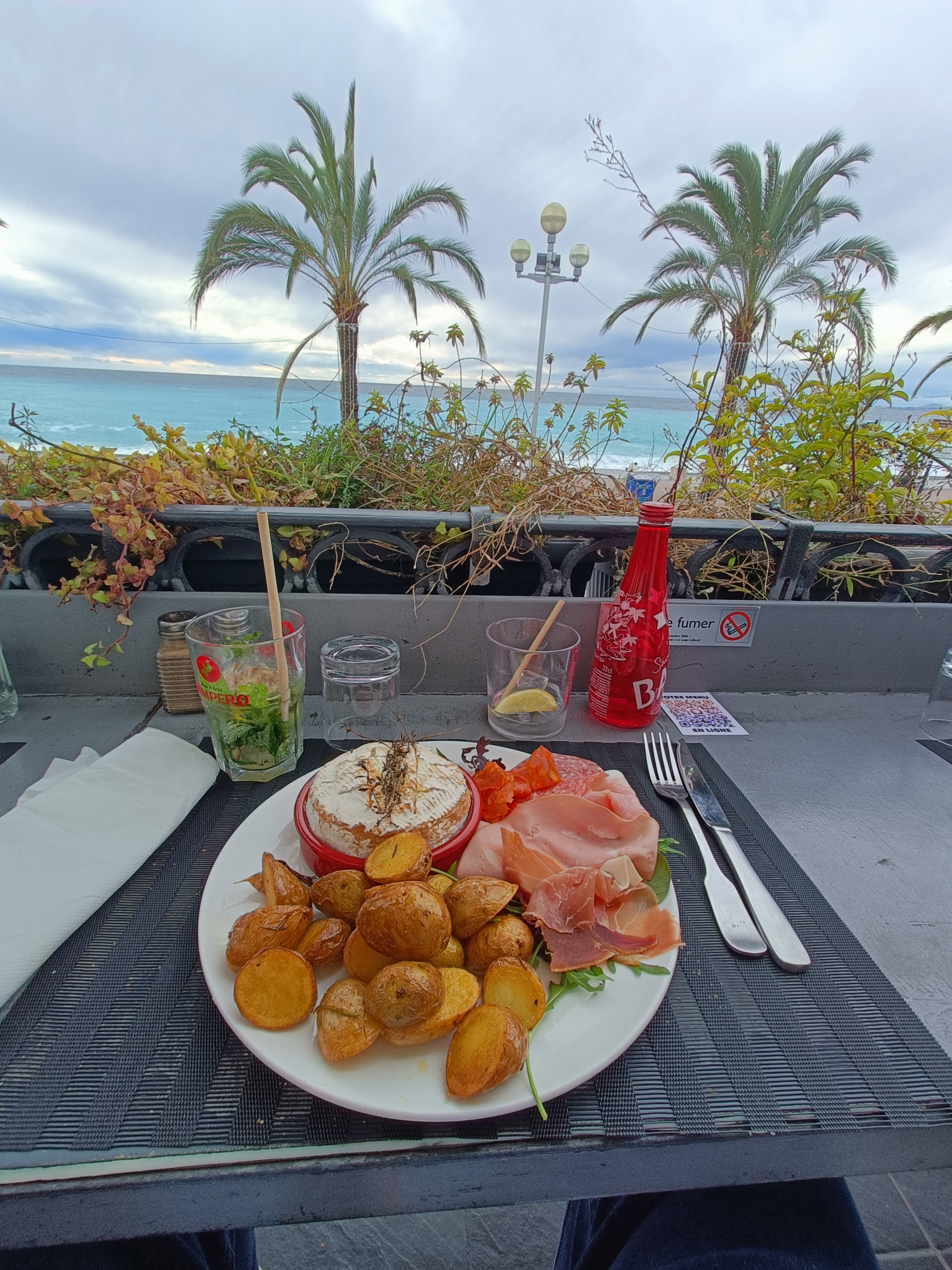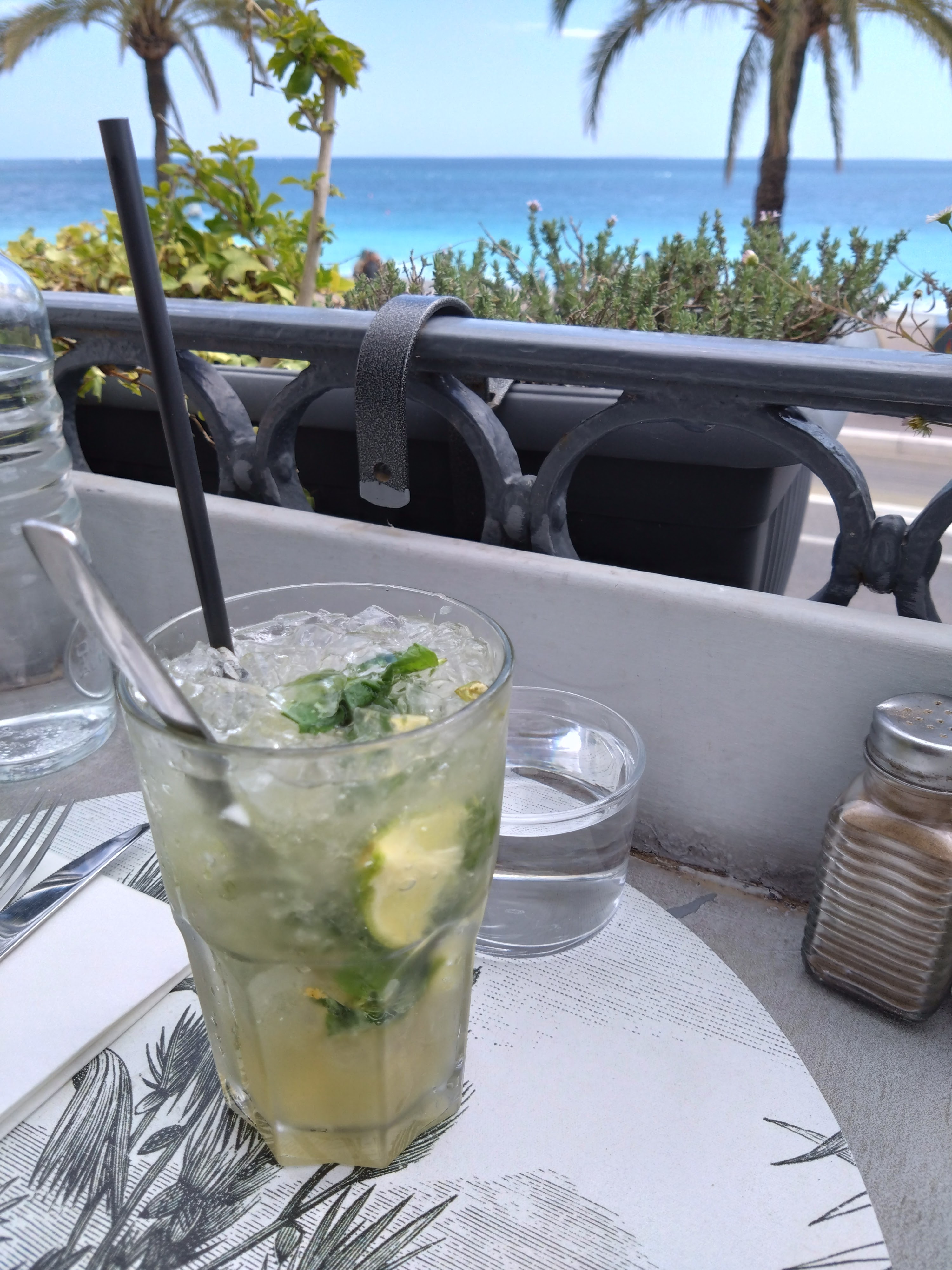 Arrive seul juste avant le fin du service dans soucis. Accueil très agréable, vue a l'étage incomparable sur la promenade. Non fumeur a l'étage et c'est tant mieux. Mais surtout tout a été délicieux, les prix sont chers certes mais honnêtement y en a dans l'assiette. Le poisson filet de loup délicieux très bien assaisonné et accompagné. La crème brûlée délicieuse. Et j'oubliais le mojito sans alcool est impeccable hyper bien réussi et croyez moi j'en ai goûté dans beaucoup d'endroits. Rien à dire de négatif ne serais que le bruit de la circulation mais on es a Nice ... Seul bémol l' apéro servi en même temps que le plat