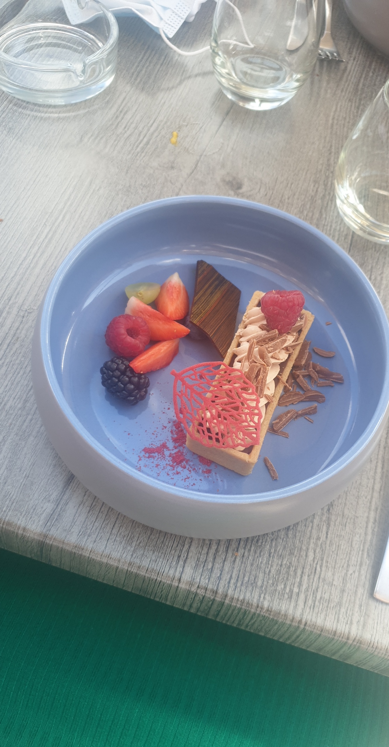 Un restaurant qui donne vue sur le bassin de plaisance, un nombre de table raisonnable, avec un dessert au même niveau que le plat. Le menu enfant sort du steak haché frite ,le plat et dessert sont du même niveau que pour les parents. On reviendra c'est promis!