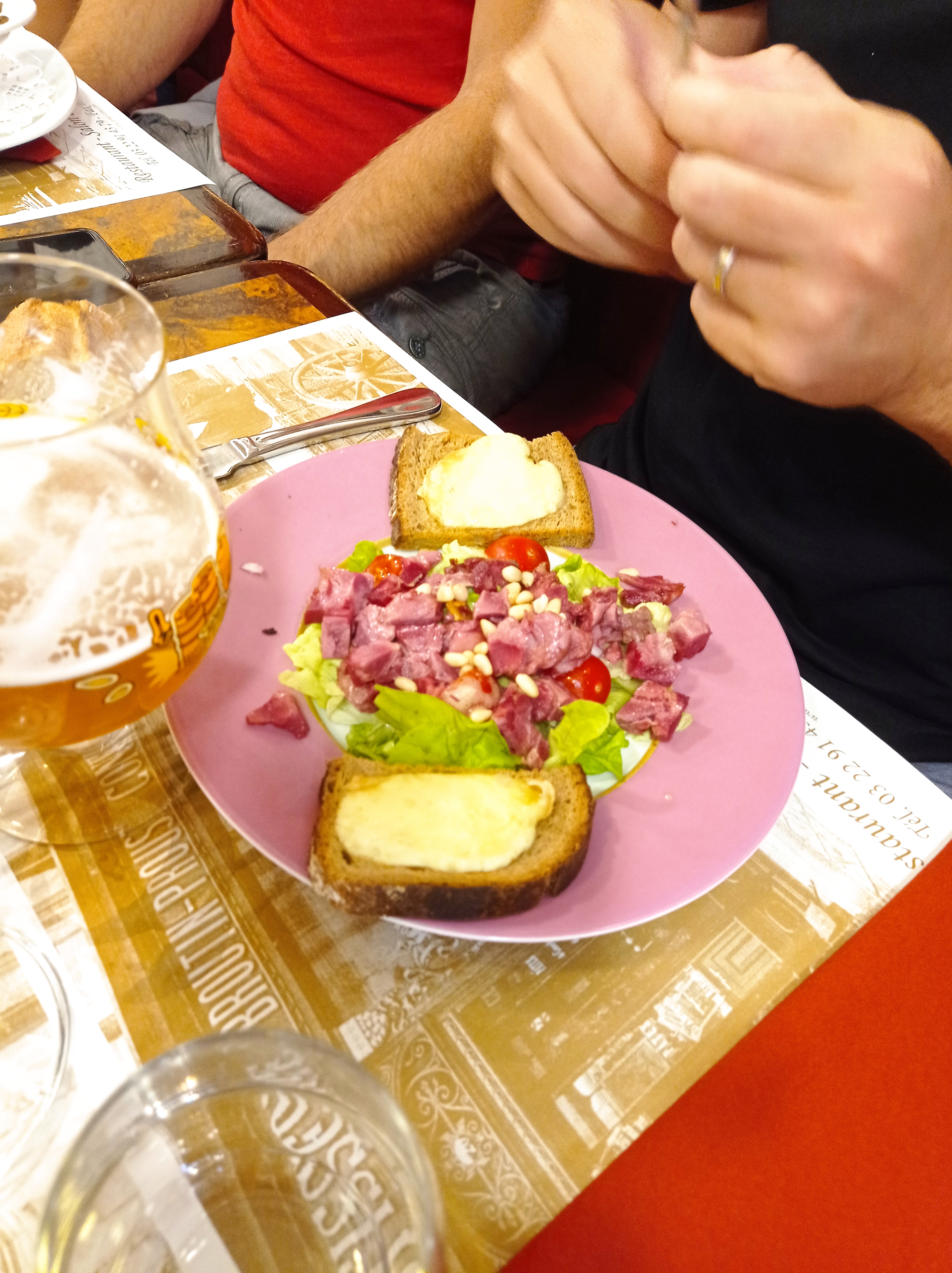 Ficelles picardes accompagnées de frites et salade, très bon. Personnel aimable. Installés en bas, odeur fort désagréable et service un peu long