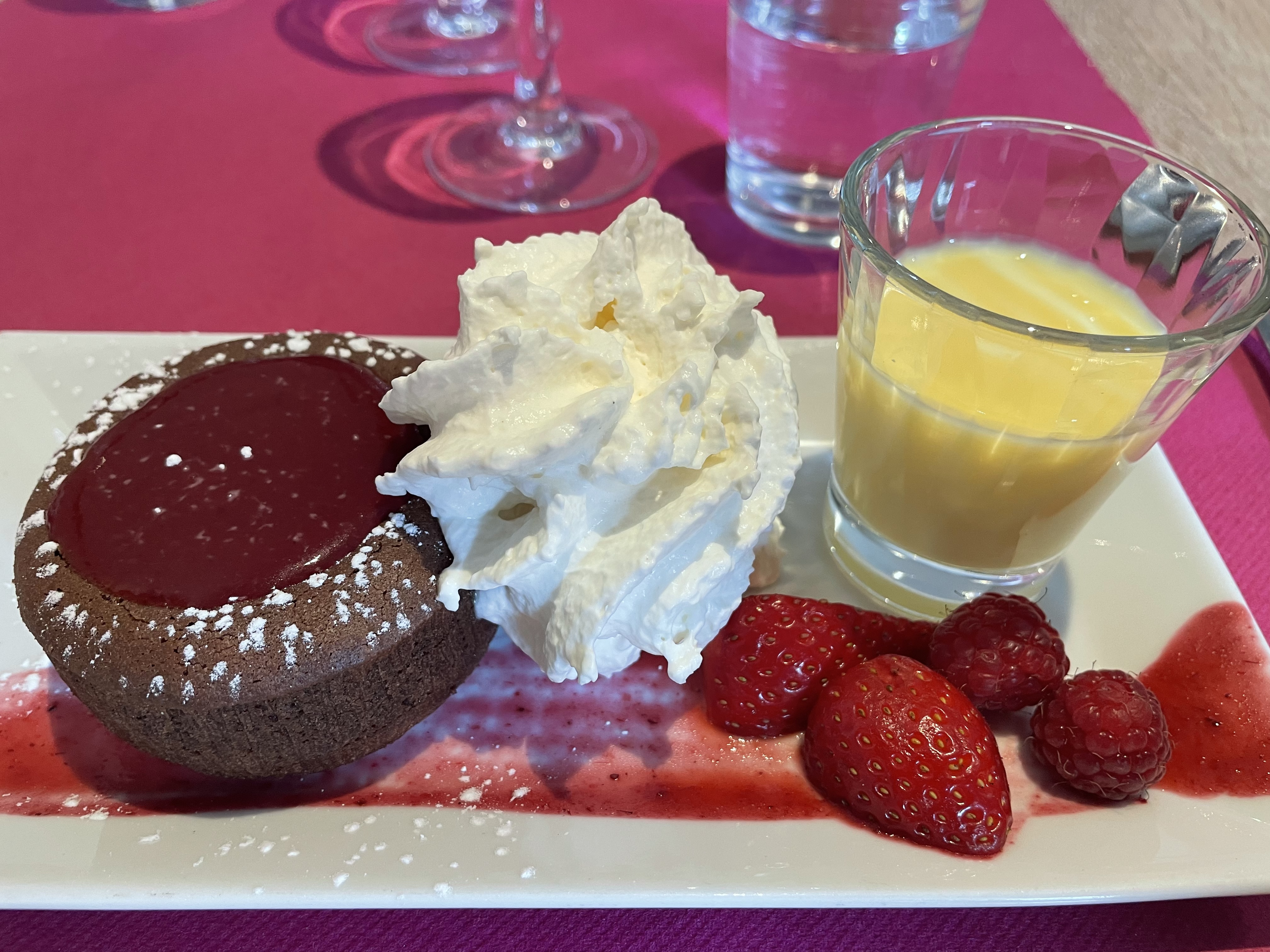 Cuisine ok. Assiettes tres copieuses. Desserts pas exceptionnels trop de mélanges fromage blanc aux fruits rouges + miettes de brownie (ça n'apporte rien mais les miettes sont gorgées du coulis de fruits).