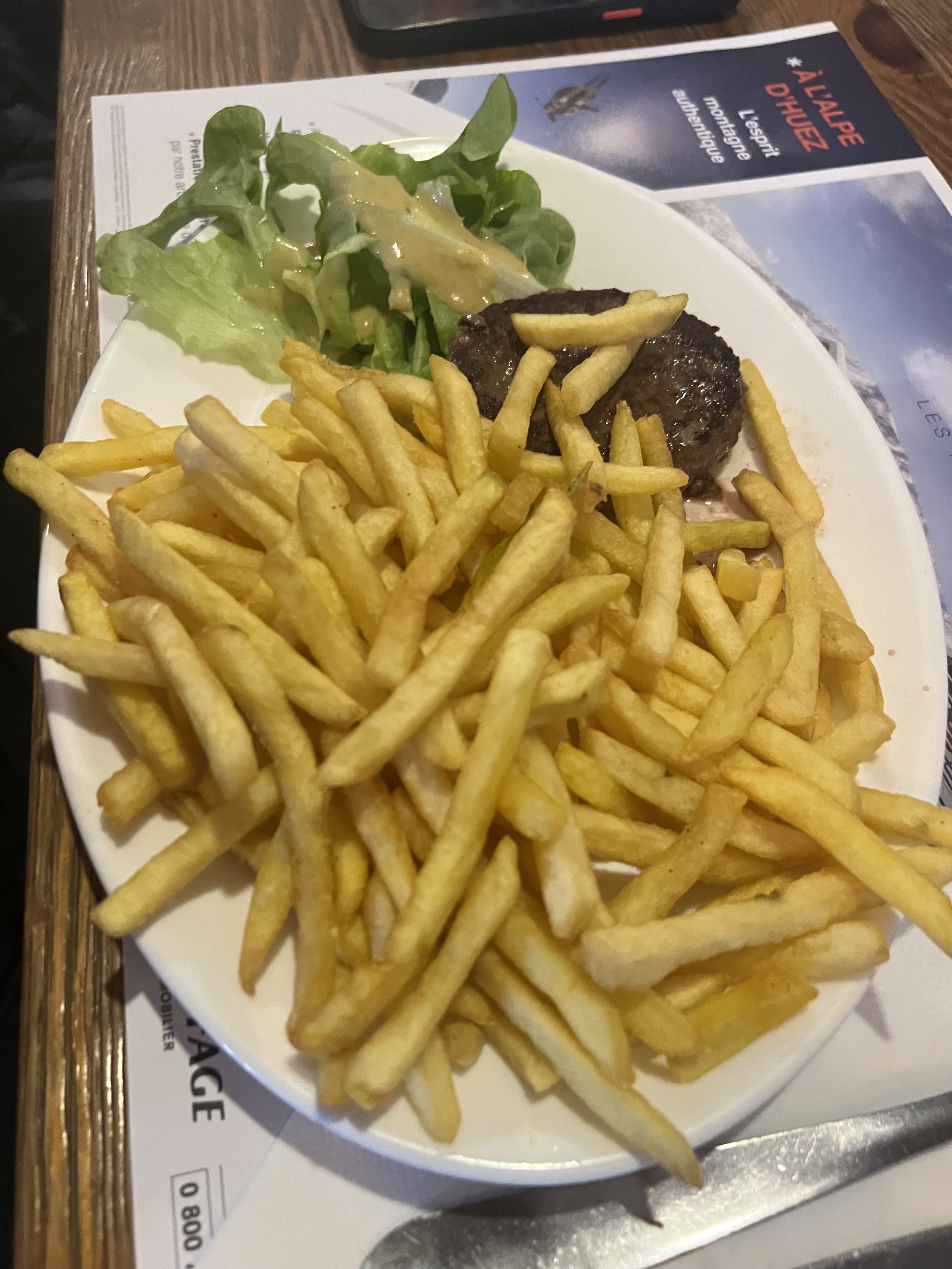 Une serveuse agréable qui glisse à chaque pas (en baskets) sur une terrasse gelée. Le reste est bien moins positif: nous étions 4 à table sur laquelle se trouvaient déjà les couverts et les verres (mal nettoyés). Nous avons commandé des steaks hachés frites (pour aller vite) et 1 croque salade. Ce dernier est arrivé 15 minutes après les 3 steaks frites. Les frites avaient un goût très désagréables et remplies de petits résidus noirs. Nous pensons que l’huile de la friteuse doit à servir à tout dans ce restaurant, et ne date pas d’hier!… Nous n’avons jamais mangé des frites aussi mauvaises (goût difficile à décrire: poisson? terreux?…) Bref, nous ne remettrons plus les pieds dans cet établissement tout le reste de notre séjour à l’Alpe. L’emplacement est rêvé en bas des pistes, mais ne mérite pas que l’on s’y arrête pour autant. Dommage