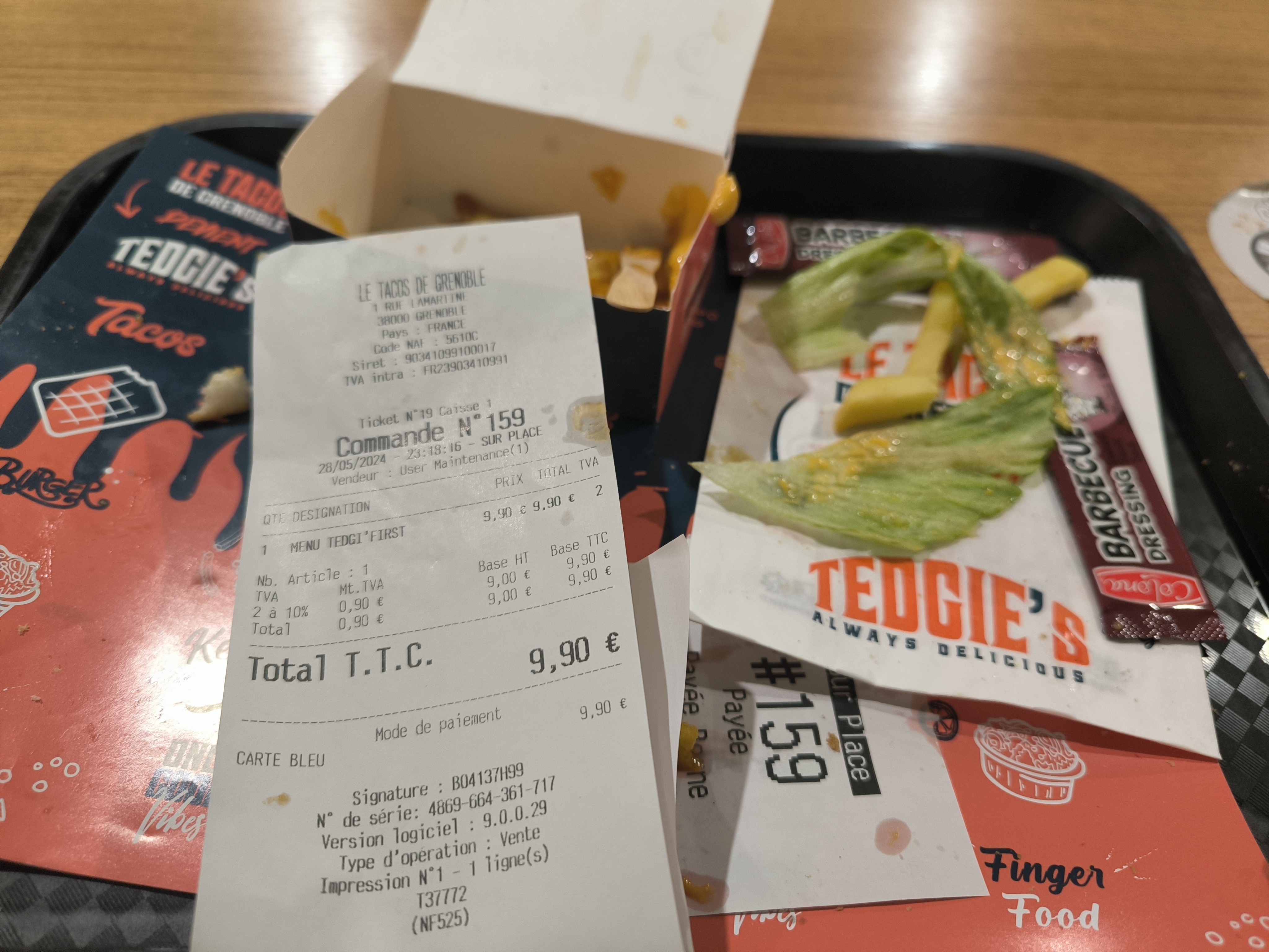 Commander un tacos avec un supplément à emporter, je me retrouve avec un tacos non demandé. Pas la viande, le supplément et la sauce demander... Edit : Deuxième chance bien passé j'ai eu le bon tacos mais 10€ le tacos avec seulement un supplement je veux bien que se soit l'inflation mais abusé