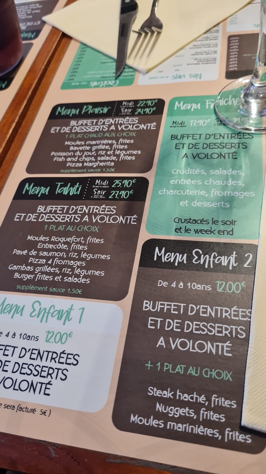 Buffet d'entrées et de desserts qui ne donnent pas envie. Menus chers. Cela fait 10 ans que nous venons à Narbonne Plage et nous avons l'habitude de fréquenter le Tahiti, nous ne reviendrons plus s'il n'y a pas de changement