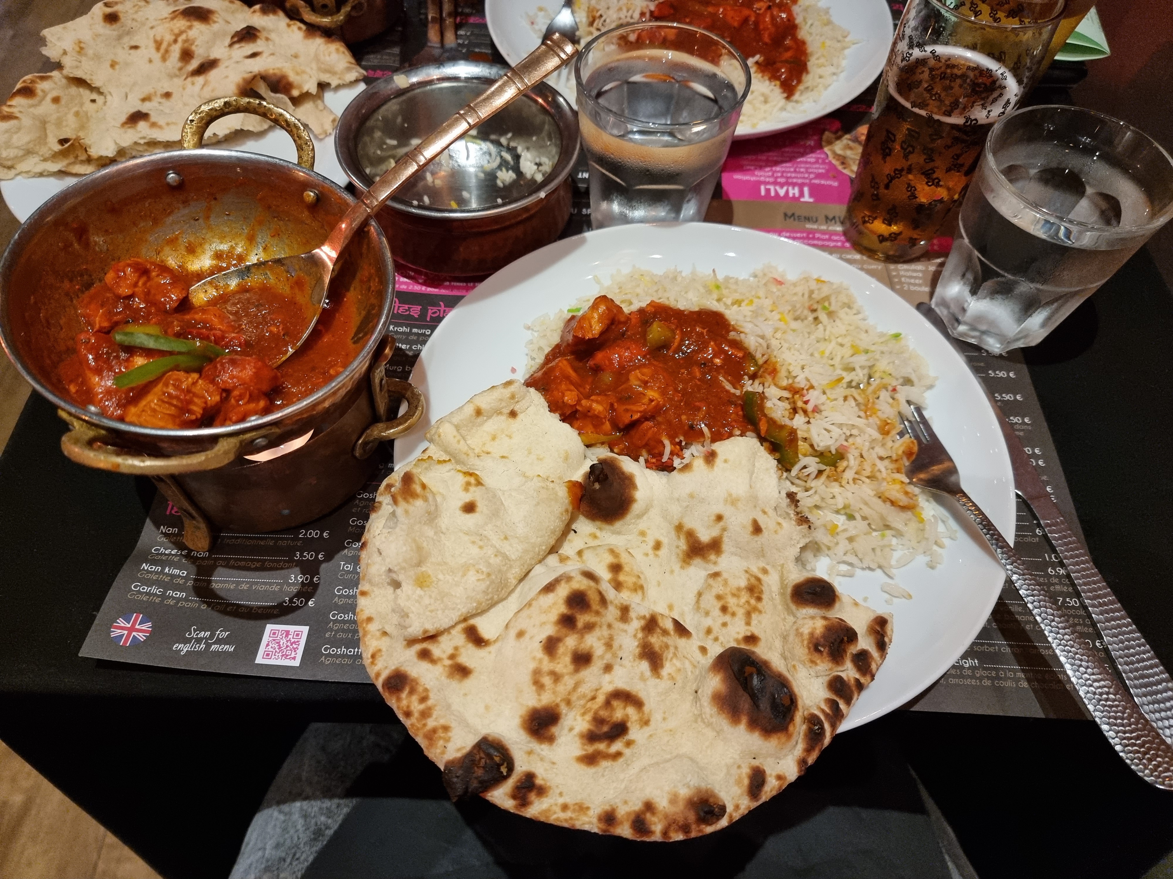 Accueil souriant et très aimable par la serveuse très gentille. Cadre agréable. Samoussa et plat poulet korma (photo 1) savoureux mais petite déception pour le plat complet servi en bloc, relevé (pimenté) alors que ce n'était pas précisé sur le menu et que j'avais bien demandé avant de le choisir. Sauce d'accompagnement à base de concombres tout mous et ensemble trop pimenté (photo 2).