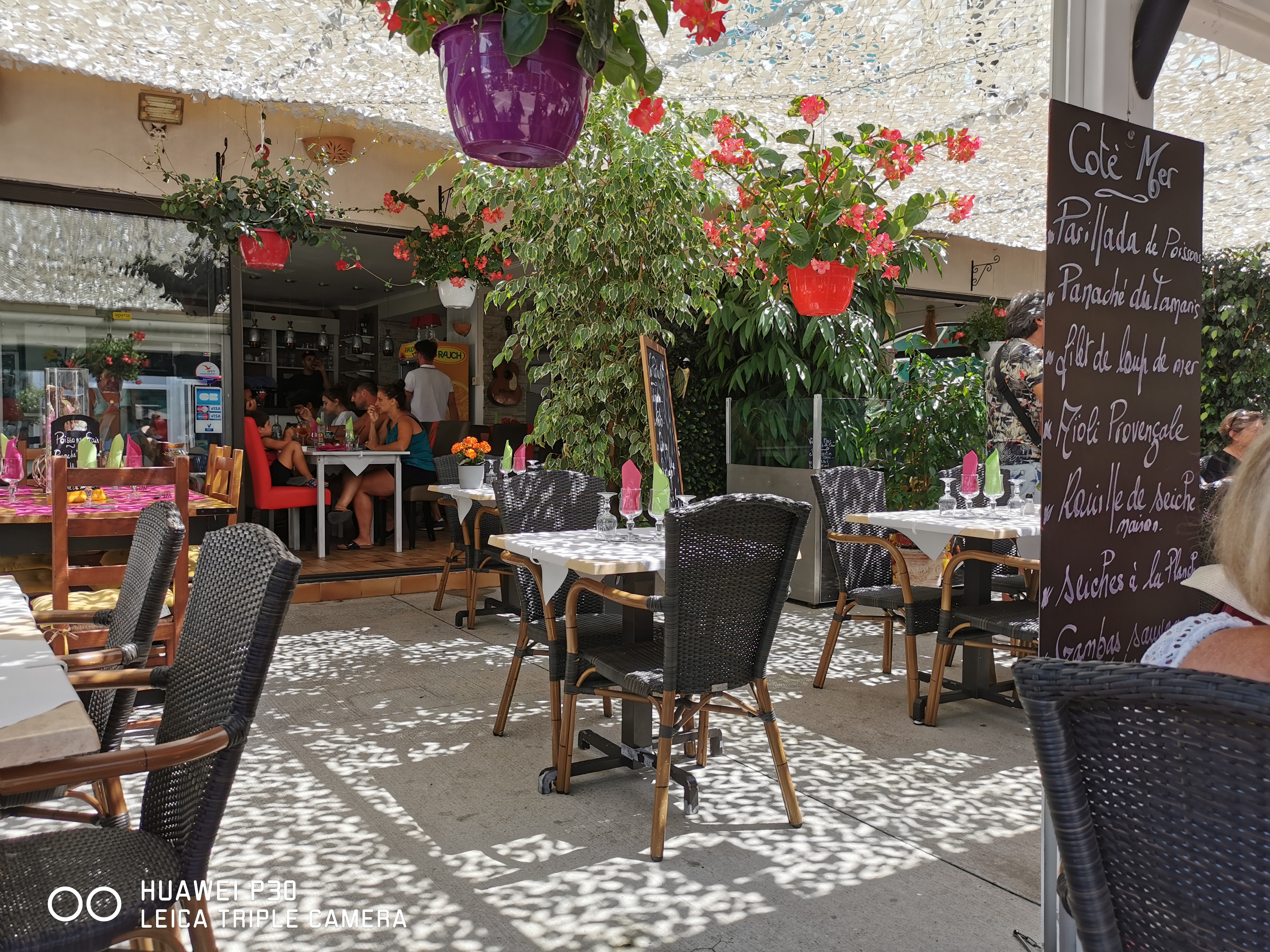Un menu excellent a 23.90 € servi par des serveurs attentionnés sous une terrasse ombragée..
