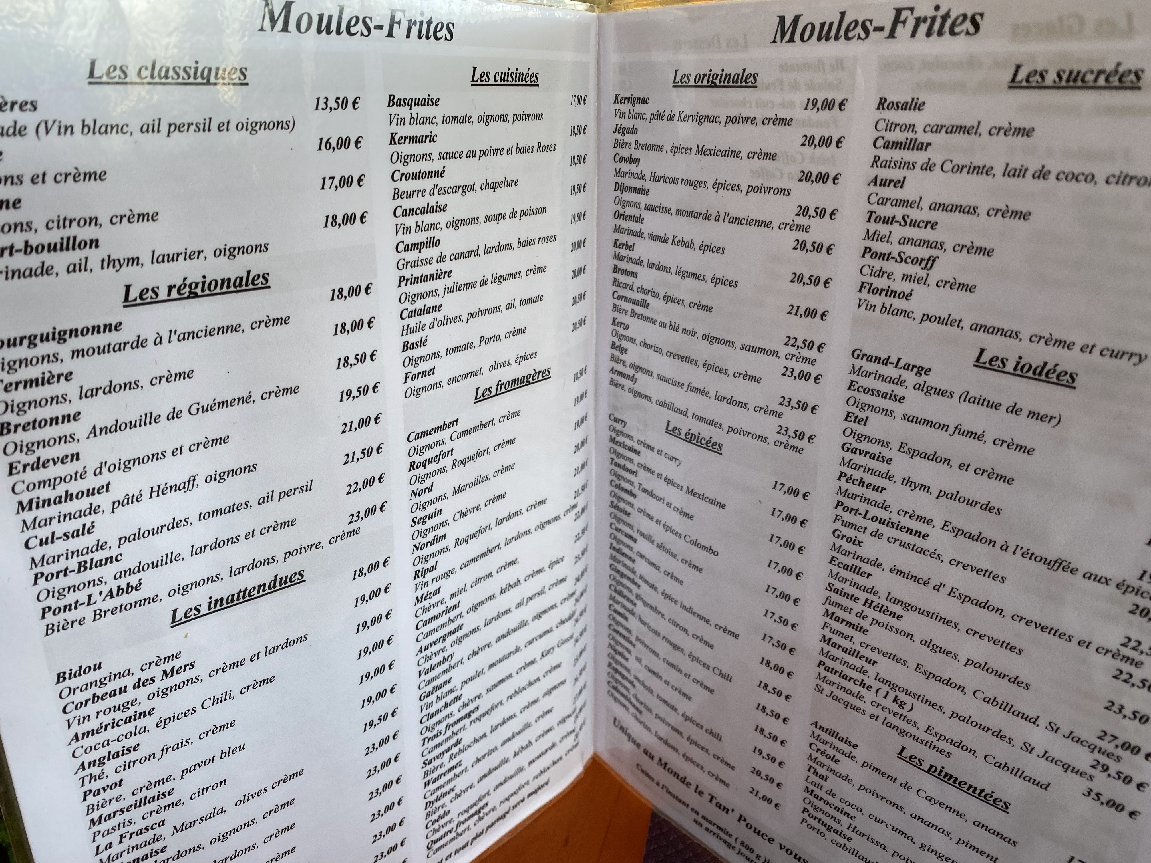 C'est un lieu où il faut absolument s'arrêter. Plus de 100 variétés de moules frites et pour ceux qui n'aiment pas menu à 22 euros, de l'entrée au dessert. Bon rapport qualité prix et en plus de cela l'équipe est super accueillante.